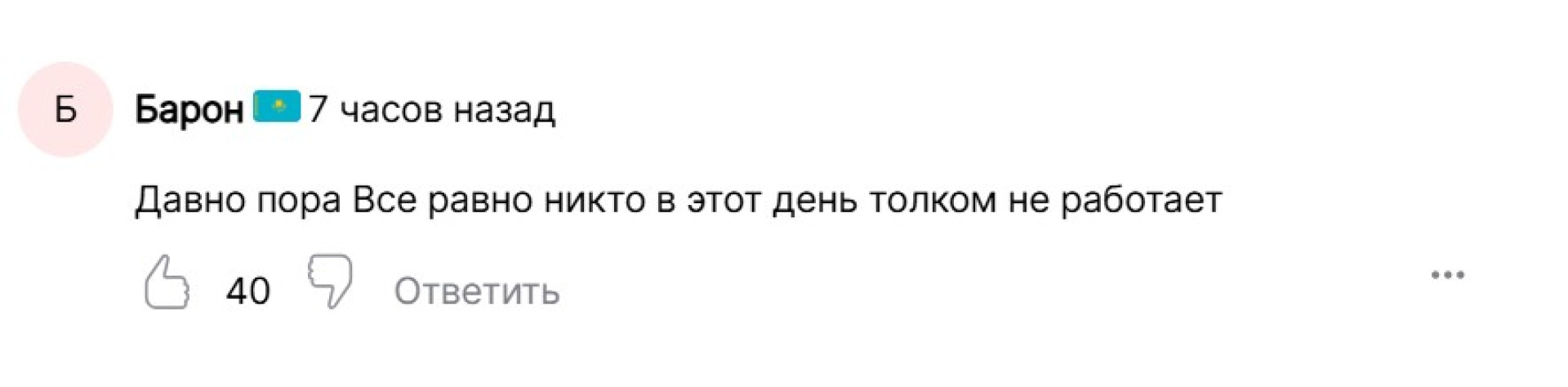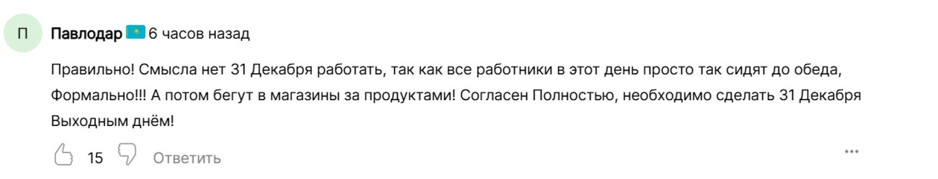 Мнения наших читателей тоже разделились: многие поддерживают идею сделать 31 декабря выходным днём. Звучали предложения и сократить рабочее время в предпраздничные дни. Некоторые пользователи считают, что спокойный отдохнувший работник, который не суетится в праздничные дни, чтобы успеть и на работу, и по своим делам, будет лучше работать, поэтому 31 декабря должен быть выходным. Но есть и те, кто считает, что "нет такого праздника - 31 декабря", и вспоминают Наурыз.