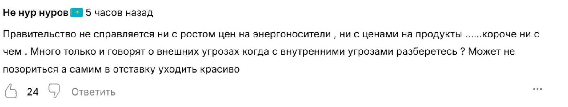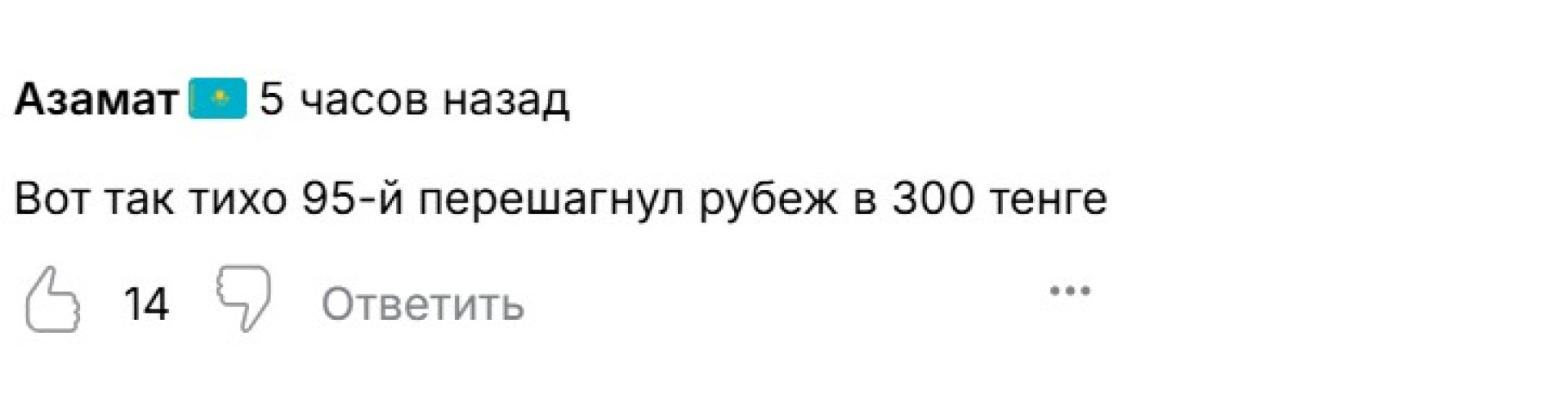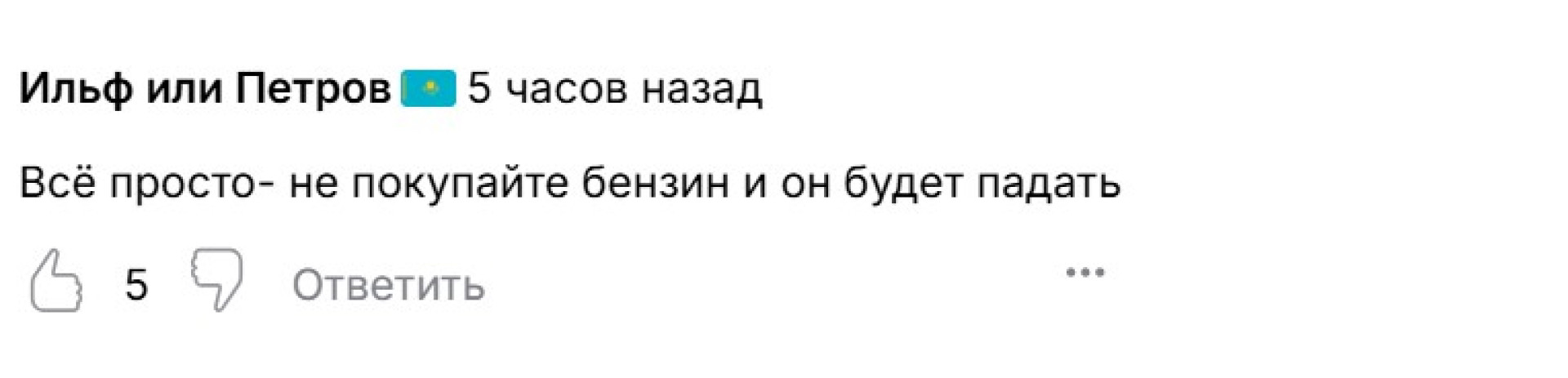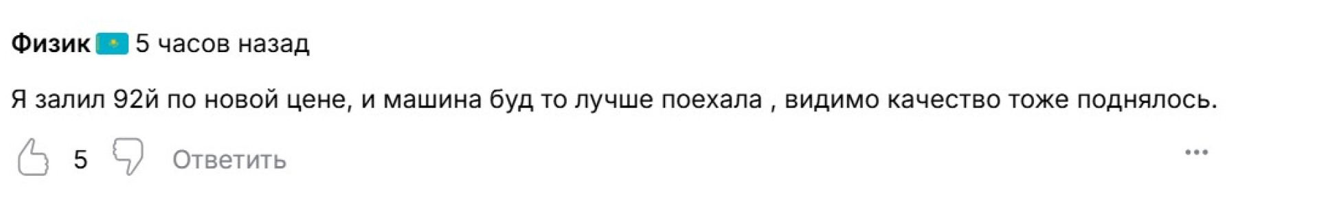 Читатели Tengrinews.kz писали, что казахстанские власти "не справляются с ростом цен на энергоносители" и продукты. По мнению некоторых пользователей, чиновникам стоило бы уйти в отставку. Другие советуют тем, кто "плачет", переходить на гибридные авто или электрокары. Некоторые пользователи то ли в шутку, то ли всерьёз говорят, что вслед за ростом цен повысилось и качество бензина.