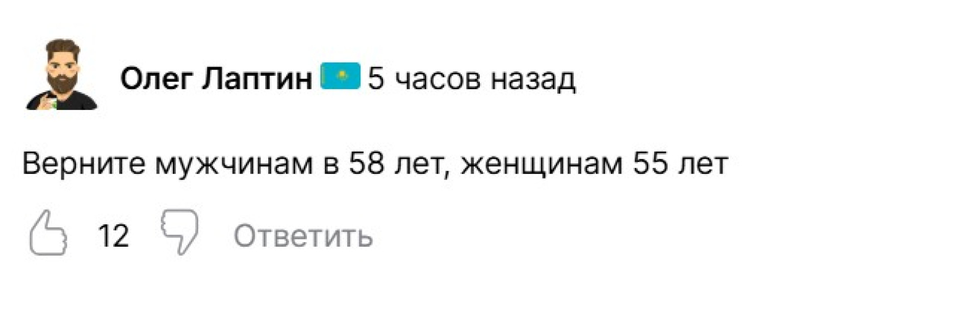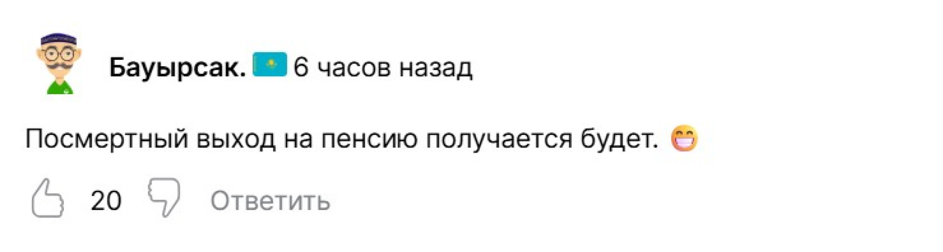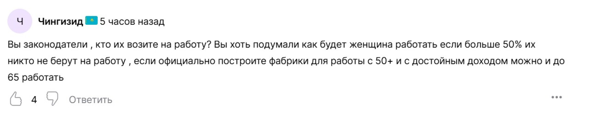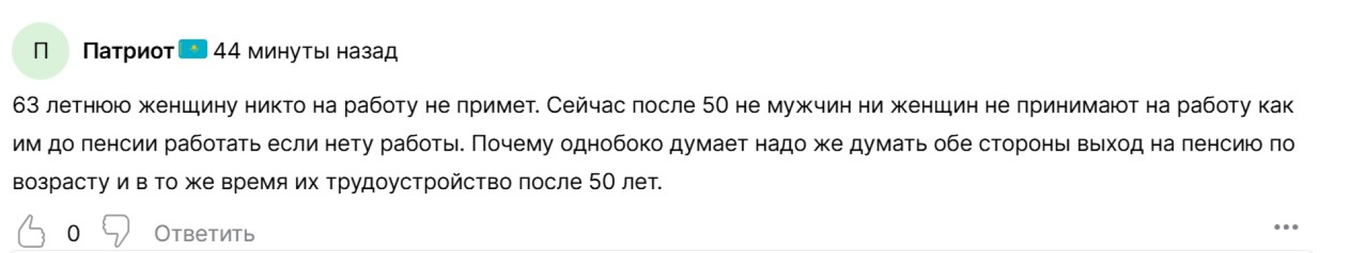 Новость стала одной из самых обсуждаемых среди читателей Tengrinews.kz. Некоторые с иронией отметили, что такими темпами выход на пенсию может стать "посмертным", другие посетовали на то, что людям старшего возраста сложнее устроиться на работу. Третьи попросили вернуть старые возрастные пороги: для мужчин - 58 лет, для женщин - 55.