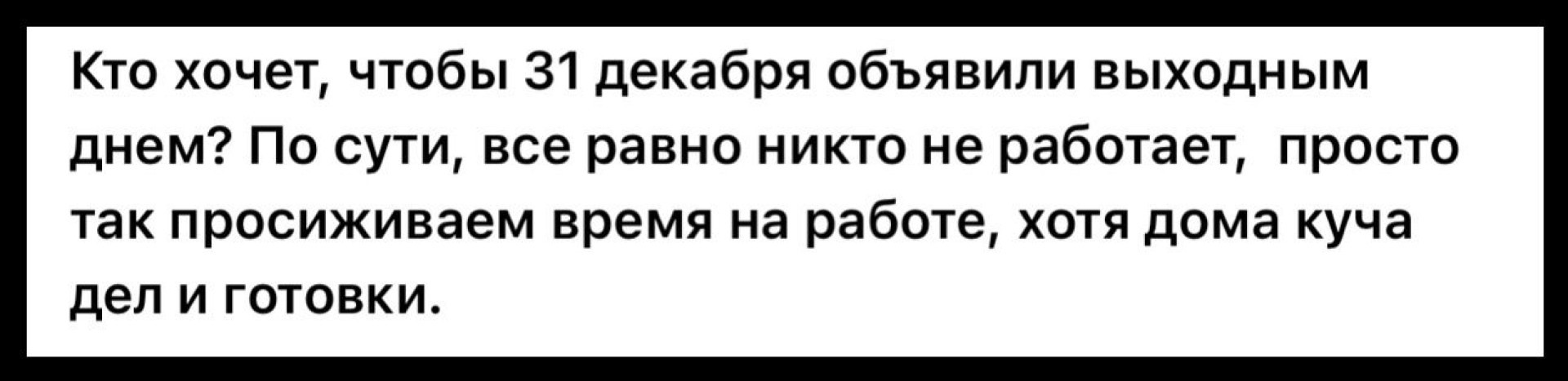 Часть комментаторов уверена: выходной в канун Нового года нужен, потому что важно успеть подготовиться к празднику. Другие считают, что 31 декабря один из самых активных рабочих дней, например, в продажах.