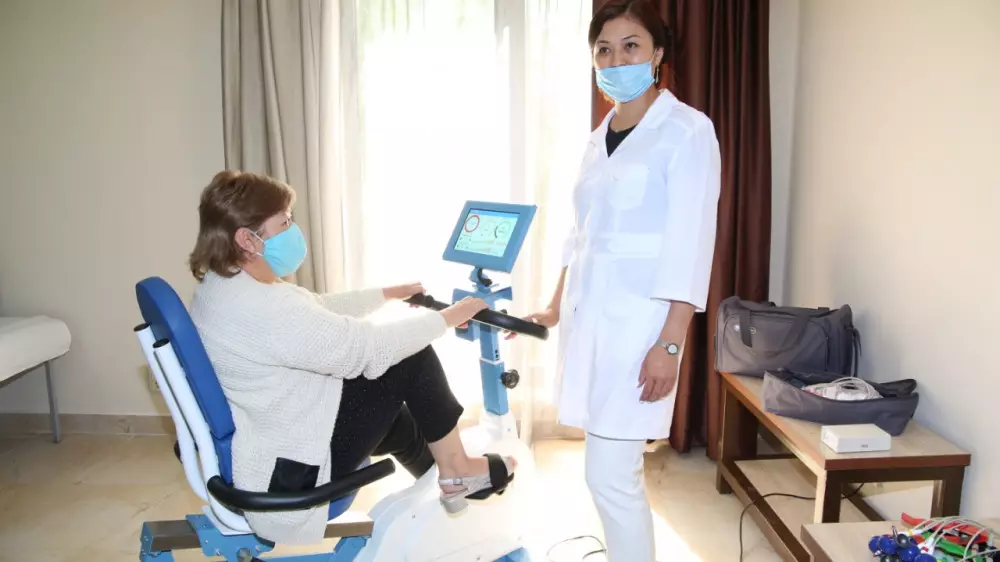 "Дыхательные упражнения проводятся с помощью новых аппаратов, улучшающих вентиляцию легких и повышающих их объем. Тяжелобольные пациенты занимаются на стимулирующих тренажерах, где они не нагружаются. Их фиксируют, благодаря чему работают строго необходимые группы мышц. В среднем за день пройти курс лечебной физкультуры могут более 80 человек", - рассказал инструктор лечебной физкультуры Изимжан Кибиров.