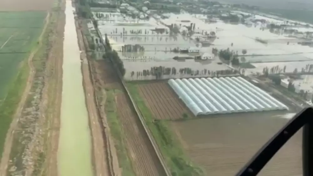 В Мактааральском районе Туркестанской области объявлена чрезвычайная ситуация после того, как в Узбекистане прорвало дамбу. Показали видео последствий затопления с высоты птичьего полета, передает корреспондент Tengrinews.kz.