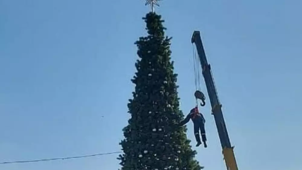 В Сети появилось фото, на котором запечатлен рабочий, подвешенный на стреле крана во время украшения главной городской елки на площади Исатая и Махамбета в Атырау, передает Tengrinews.kz.