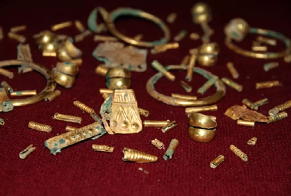 "При раскопках одного из курганов было выявлено не разграбленное погребение эпохи бронзы. В гробнице, сооруженной из крупных обработанных каменных плит, были найдены три керамических сосуда, деревянный поднос (астау для мяса), а также изделия из золота и бронзы: серьги, подвески, бляшки, наконечники, бусины, браслеты и пластины", - говорится в сообщении.