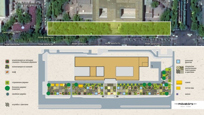 Согласно концепт-плану, основной объем реконструируемой территории располагается вдоль южной стороны проспекта Абая, в промежутке от улицы Байсеитовой до улицы Желтоксан. Помимо разнообразных видов покрытия пешеходной зоны, в проекте предусмотрены размещение малых архитектурных форм, декоративных композиций из камней и растительности, установка фонтанных групп, в том числе "сухого" фонтана. Для удобства горожан на территории предлагается разместить лотки с едой и сцену для общественных мероприятий.