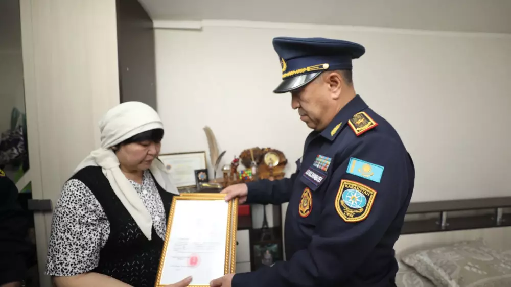 Первый вице-министр по ЧС Ибрагим Кульшимбаев 20 мая посетил семью алматинского пожарного, чтобы вручить орден. Его приняла мать спасателя Бахыткуль Курманбекова.