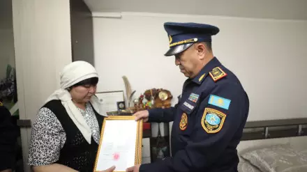 Первый вице-министр по ЧС Ибрагим Кульшимбаев 20 мая посетил семью алматинского пожарного, чтобы вручить орден. Его приняла мать спасателя Бахыткуль Курманбекова.