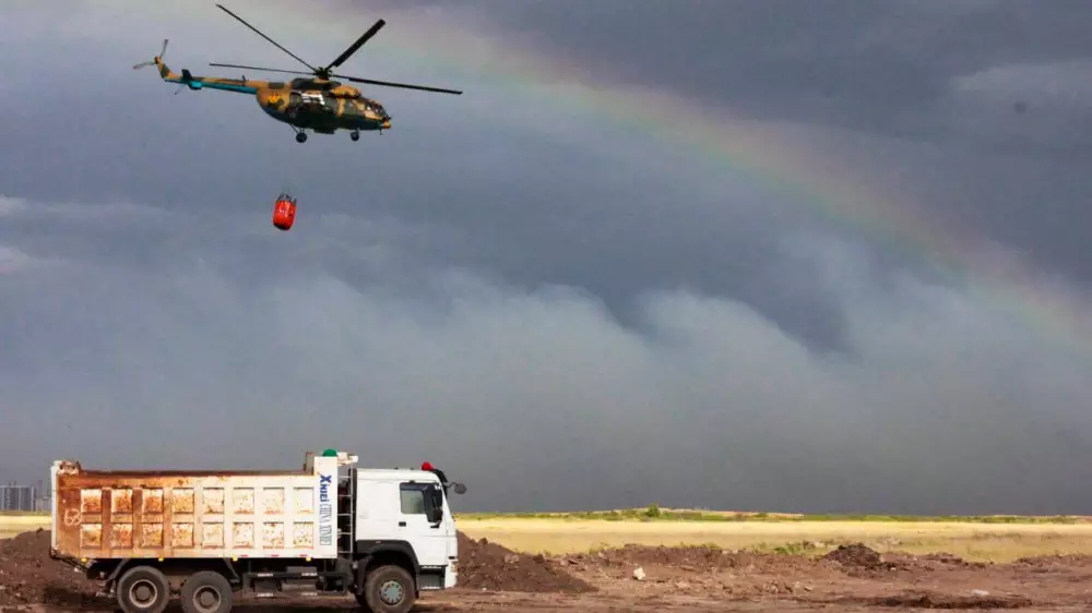 "Сегодня с утра АО "Казавиаспас" осуществлено 17 сбросов воды, это 51 тонна воды. С начала тушения пожара вертолетами Министерства обороны и АО "Казавиаспас" осуществлено 59 сбросов воды, это ориентировочно 198 тонн воды. Всего на месте тушения пожара задействовано 185 человек личного состава и 37 единиц техники ДЧС Астаны, Акмолинской и Карагандинской областей, шесть поливомоечных машин акимата города.