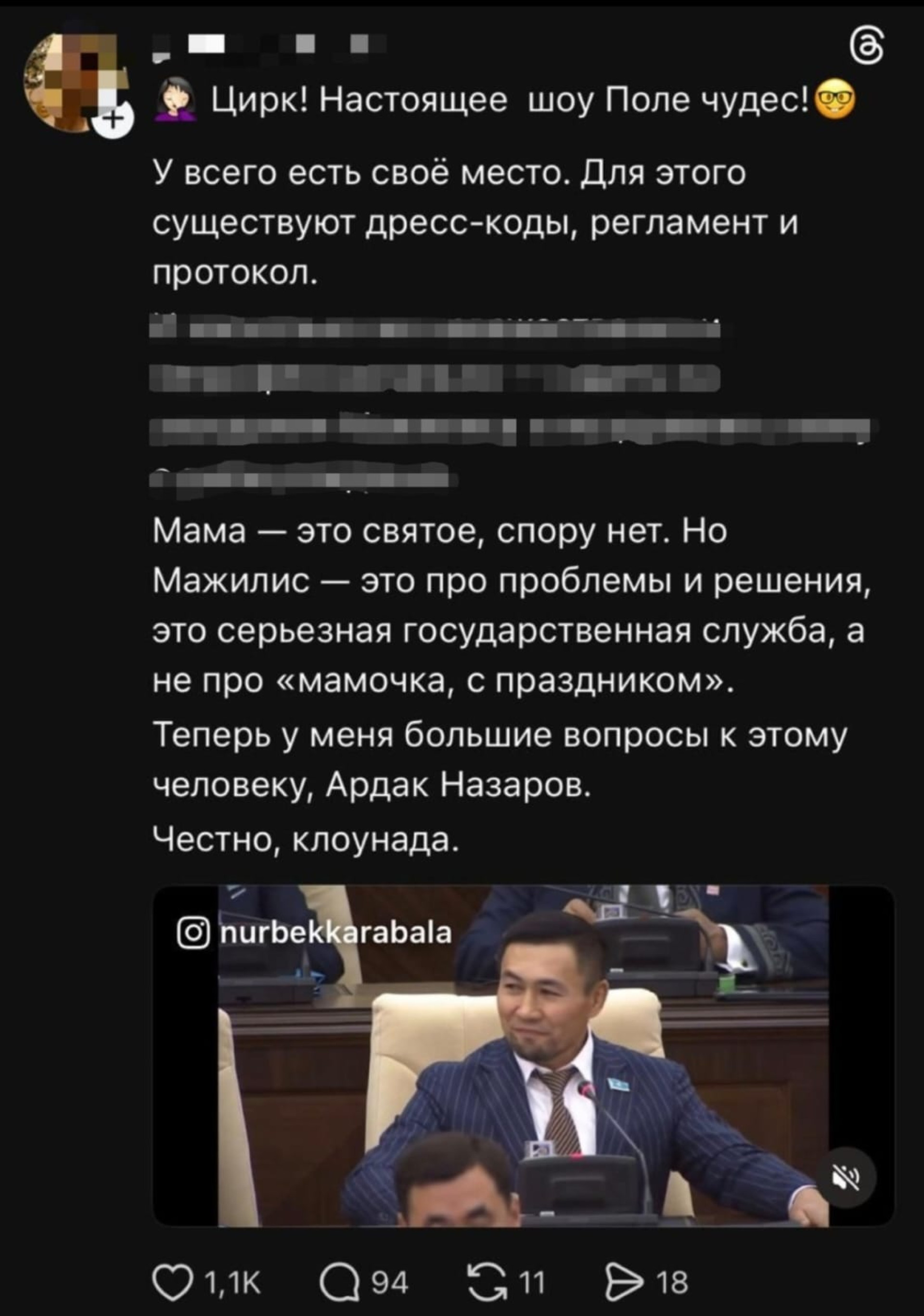 "Мажилис — это про проблемы и решения, это серьёзная государственная служба, а не про "мамочка, с праздником". Теперь у меня большие вопросы к этому человеку, Ардак Назаров. Честно, клоунада", — написал один из пользователей.
