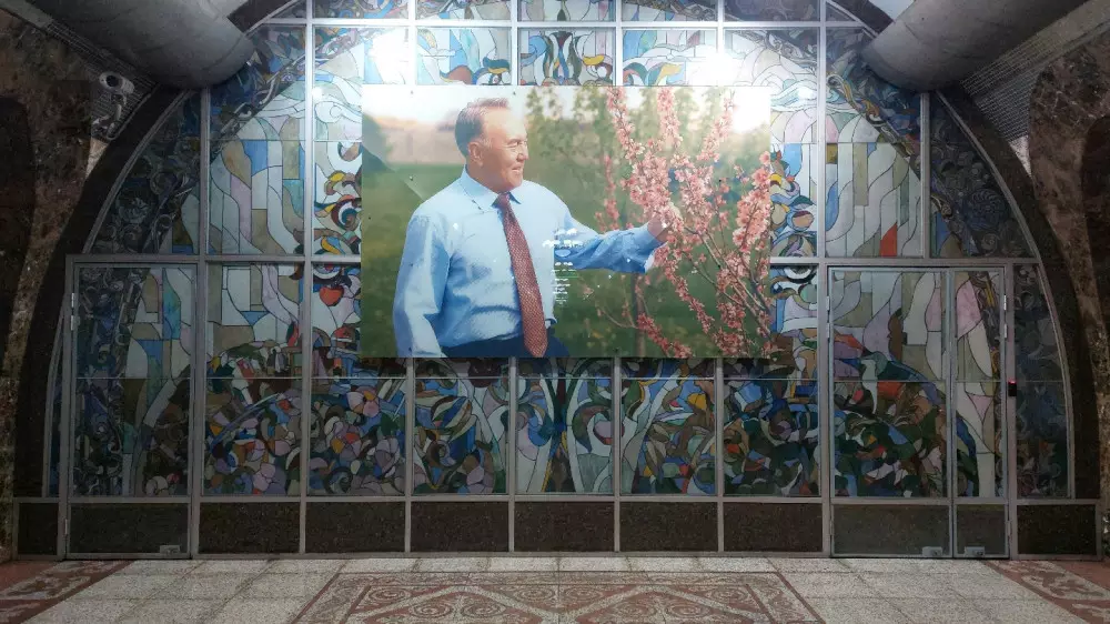 Отметим, что фотография Назарбаева встречала пассажиров на входе в станцию с момента ее запуска 1 декабря 2011 года. Ее установили поверх витражного панно "Алмалы" работы художников Газиза Ешкенова и Айдара Жамхана. Панно из цветного стекла изображает цветущую яблоню. На фотографии бывший президент также смотрел на ветку яблони.