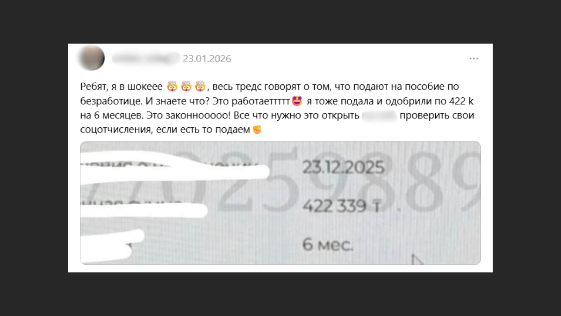 В соцсетях появилась волна постов о пособиях по безработице. Пользователи делятся, что получают более 400 тысяч тенге в месяц, и призывают других подавать заявки.
