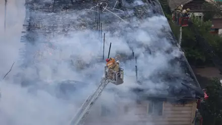 "По прибытии огнеборцев установлено, что по адресу: переулок Мирный, 17, горят хозяйственная постройка, баня и кровля частного дома с дальнейшим переходом горения на соседнее временное строение, хозпостройку, а также на кровлю трехэтажного частного дома, расположенного в переулке Фестивальный.