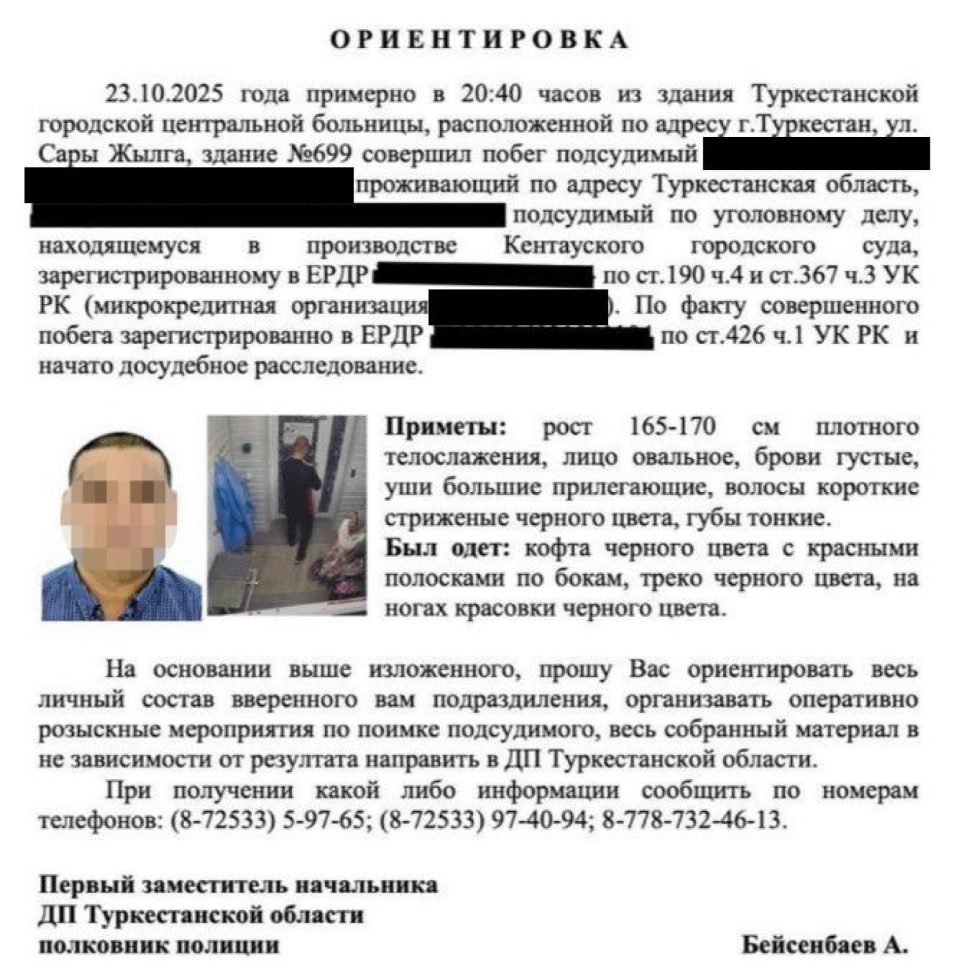 В Туркестанской области разыскивают подсудимого, сбежавшего из больницы. По данным полиции, мужчина покинул медучреждение 23 октября. В регионе объявлен розыск, выставлены посты и проводится служебное расследование.