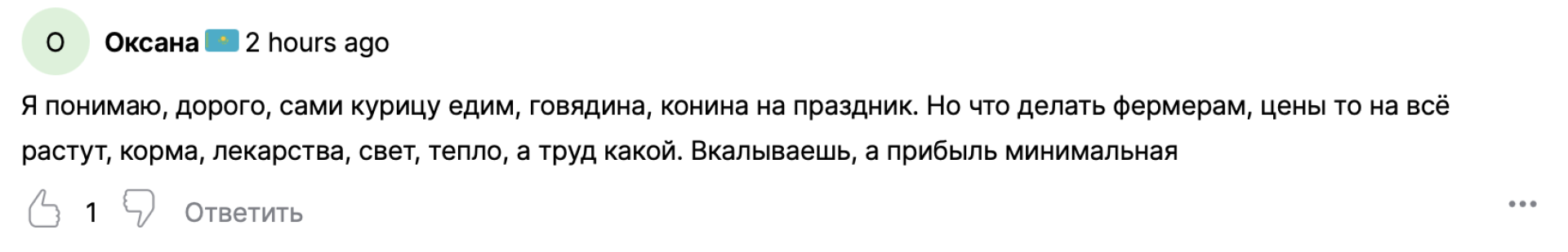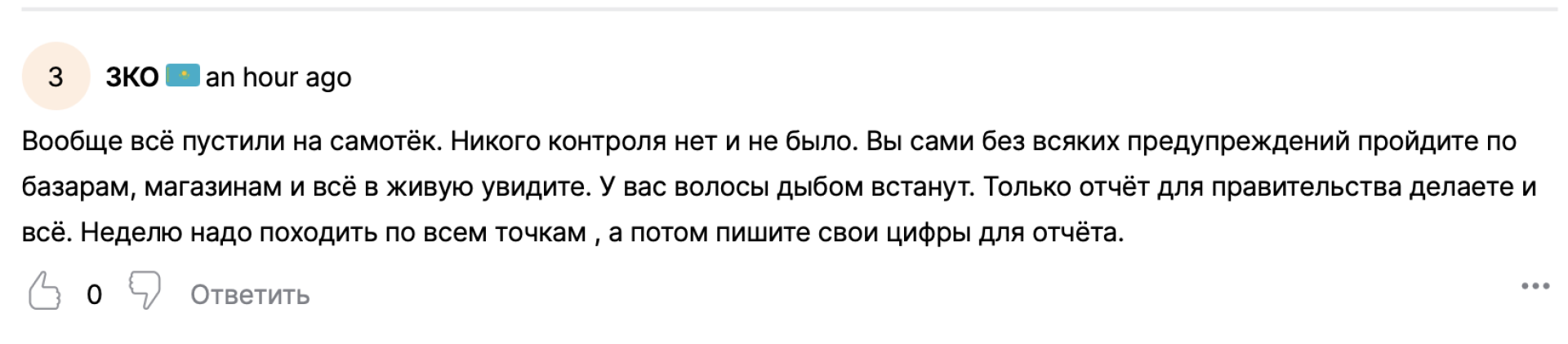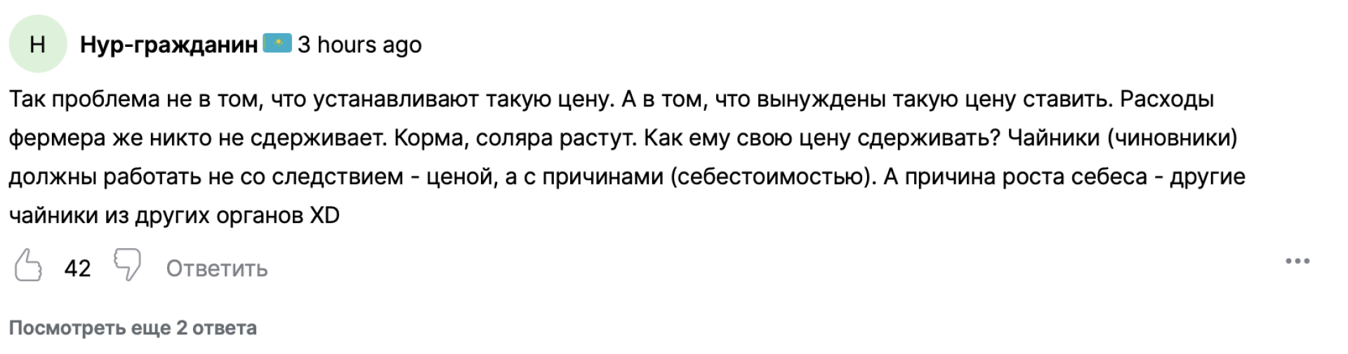 По мнению комментаторов Tengrinews.kz, проблема не в самой наценке, а в растущей себестоимости у производителей: дорожают корма и топливо, поэтому фермеры вынуждены поднимать цены. Читатели утверждают, что власти должны работать не со следствием (ценой на полке), а с причинами роста затрат. Звучали жалобы на слабый контроль и "цены с потолка", скепсис, что товары все равно подорожают "без оснований", и призывы к внезапным проверкам рынков и магазинов, а не к формальным отчётам.