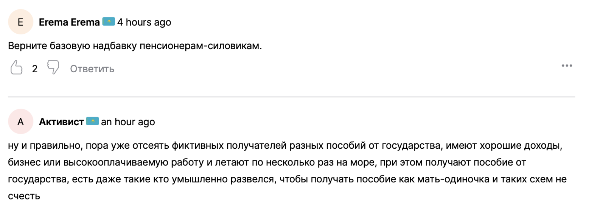 В комментариях читатели Tengrinews.kz отмечают, что среди получателей пособий есть люди с высокими доходами и собственным бизнесом, которые при этом продолжают получать помощь. Звучат примеры частых поездок за границу на отдых и сообщения о фиктивных разводах ради статуса одинокого родителя. По их словам, такие схемы нужно отсекать через проверку нуждаемости и единые правила назначения выплат.