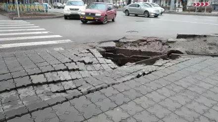 Фотографии огромной ямы появились в Facebook-группе "Дежурный по городу". На кадрах видно, как испортилась брусчатка и провалилась под землю.