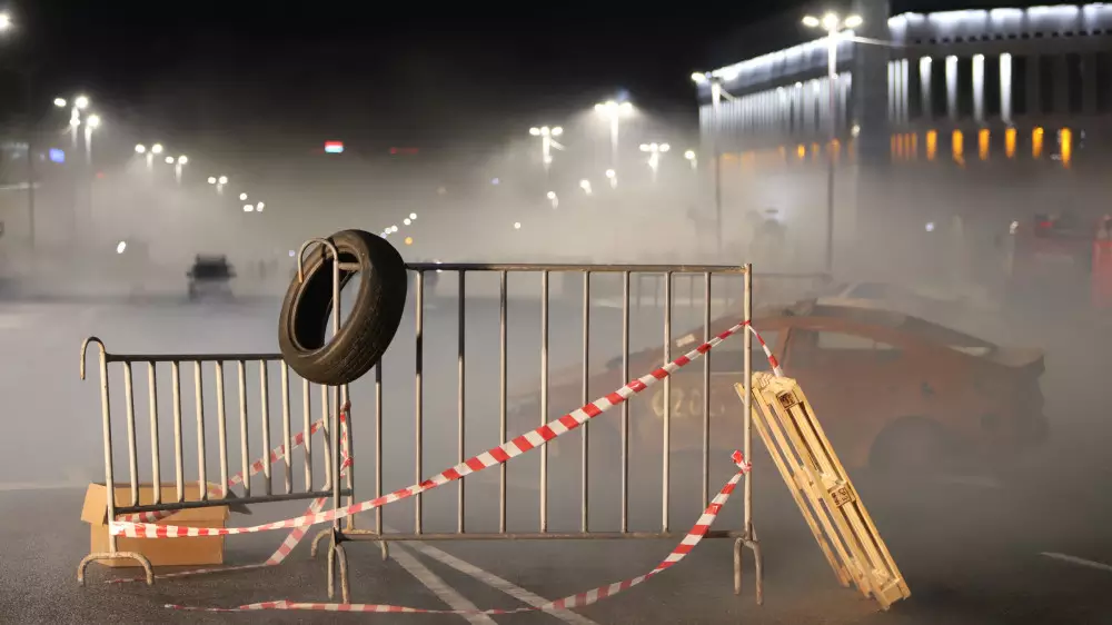 Площадь заволокло густым дымом. Тут и там перевернутые машины. В центре стоит толпа людей и скандирует лозунги. По бокам горит огонь. Со стороны может показаться, как будто события ночи с 4 на 5 января 2022 года повторились вновь. Этого эффекта и добивались авторы картины.