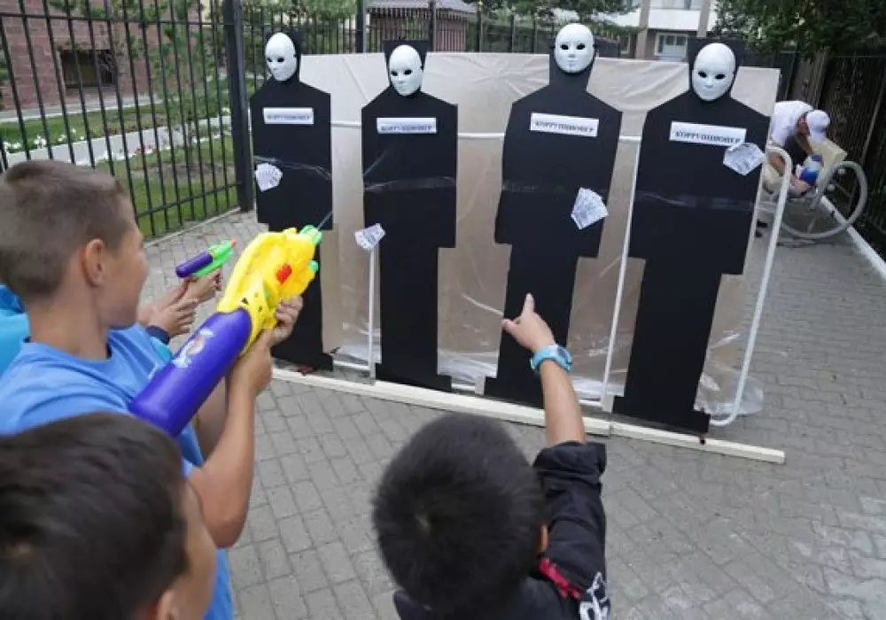 Участниками акции стали дети, несколько ребят с радостью принялись поливать фигуры струями из водяных пистолетов. На вопрос корреспондента издания о схожести акции с роликами террористов, сотрудник антикоррупционного ведомства ответил, что эта акция не о жестокости, так как пистолеты водяные, а о том, что нужно бороться с коррупцией, чтобы и взрослые и дети понимали: коррупционеры - это зло.