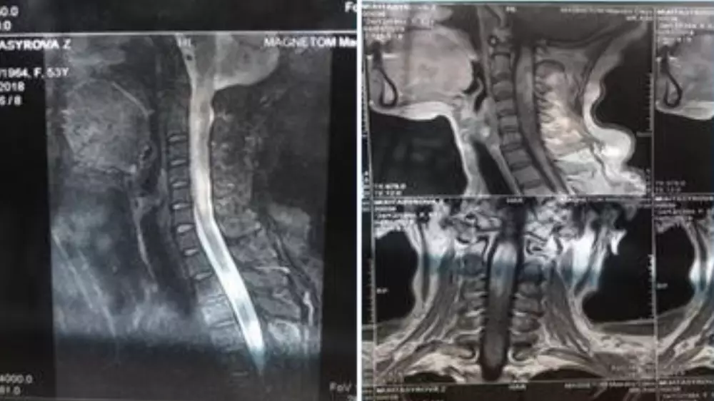 Сообщается, что 53-летняя пациентка обратилась к врачам с жалобами на общую слабость, ограничение движения в конечностях, невозможность самостоятельно вставать и ходить. Также она жаловалась на нарушение функции тазовых органов, постоянное ощущение скованности в руках и в теле.