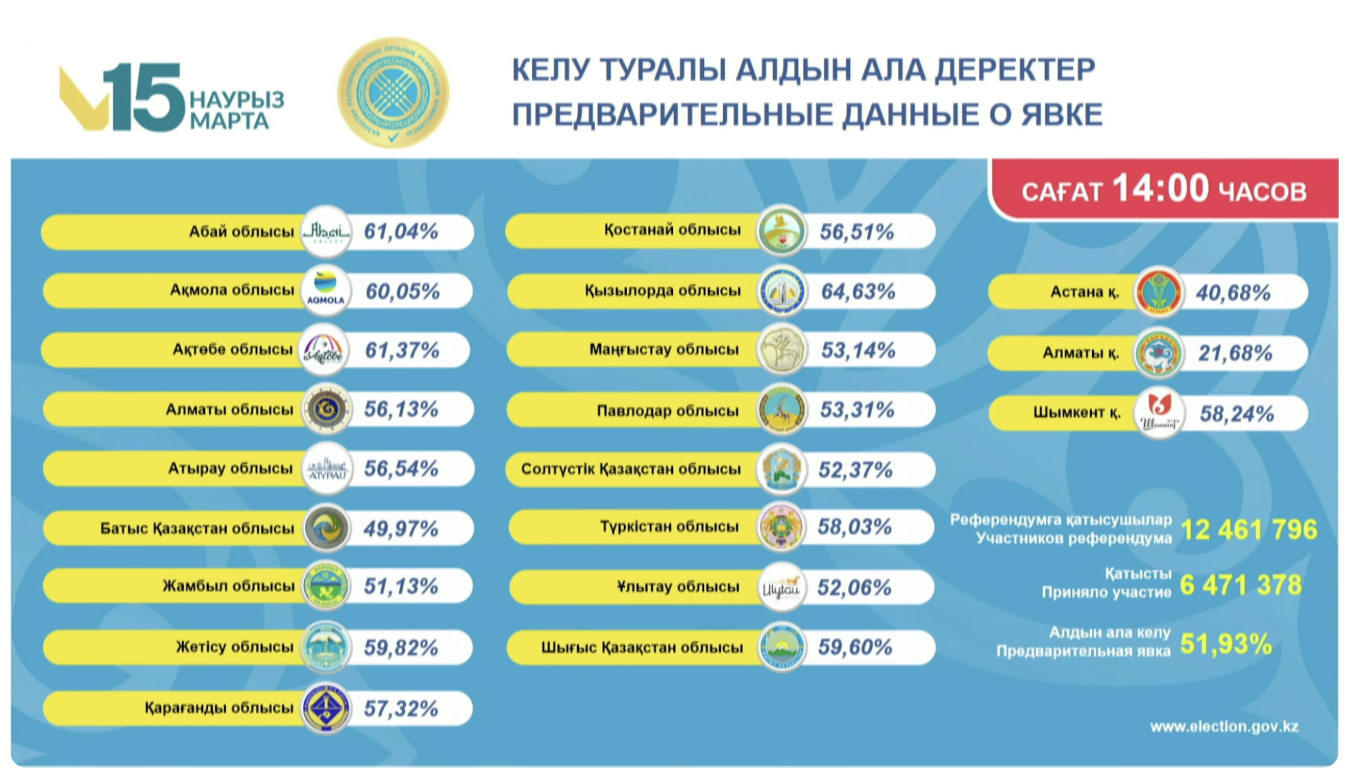 Экватор дня: по данным на 14:00 на референдуме уже проголосовали 51,93 процента казахстанцев, имеющих на это право. В ЦКР отметили, что теперь референдум считается состоявшимся.