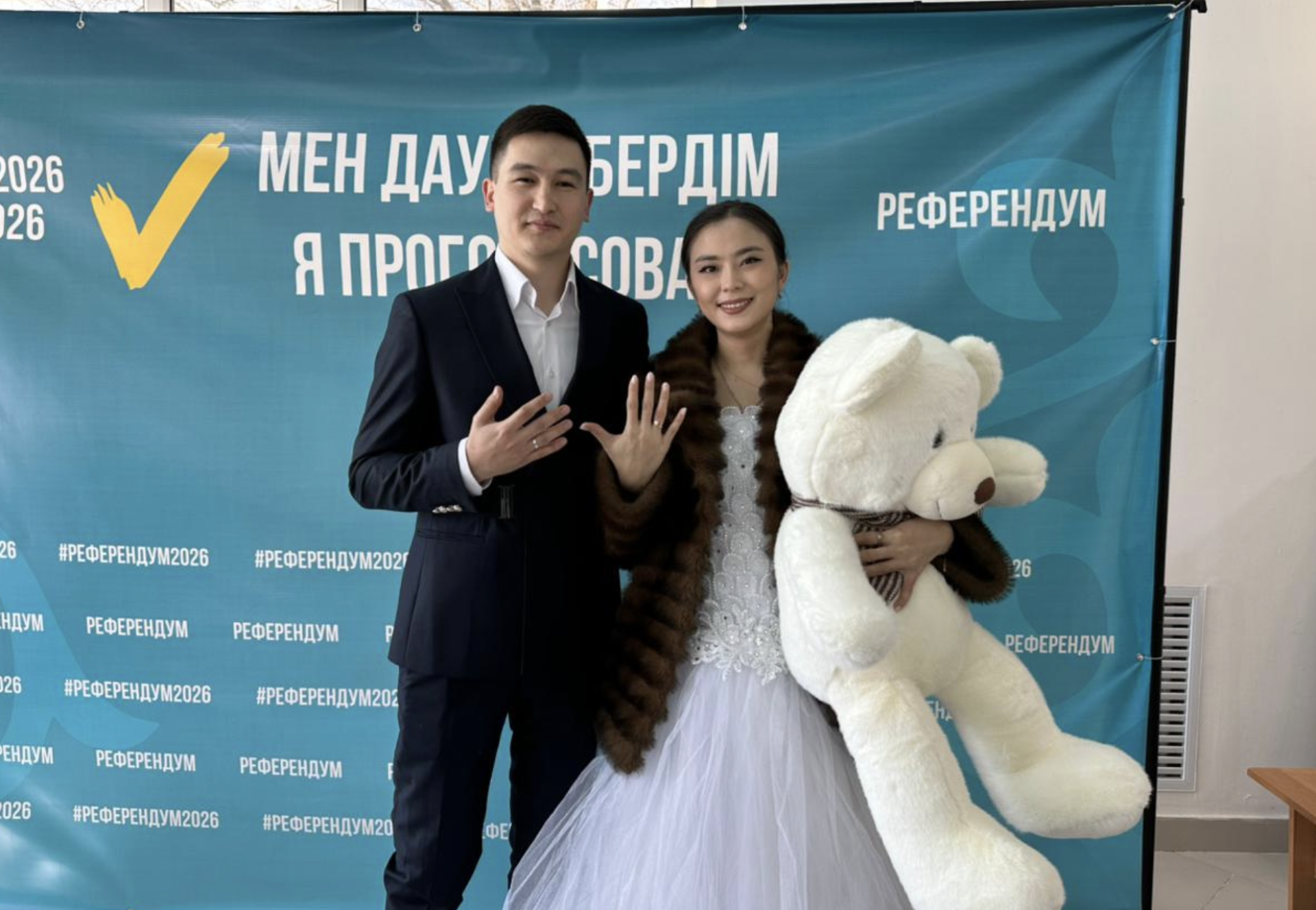 Немного свадебной атмосферы в нашу трансляцию из Балхаша. На участок №202 вместе пришли молодежены Бекнур Серикулы и Альмира Талгаткызы — нарядные, с кольцами и огромным плюшевым медведем. Проголосовали и сделали фото на память.
