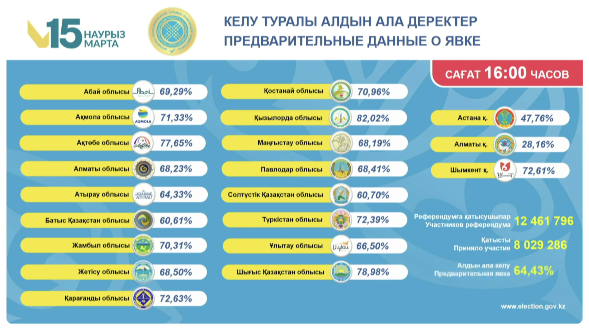 ЦИК обновил данные по явке. К 12:00 на референдуме проголосовал каждый третий казахстанец, включенный в список избирателей. В лидеры по активности вышла Актюбинская область.