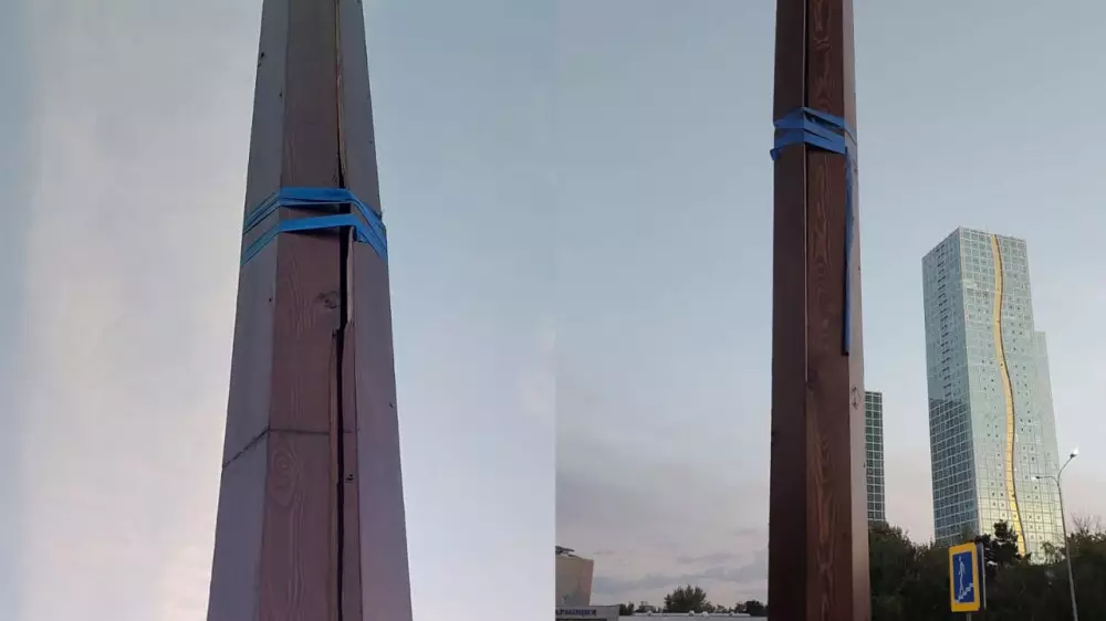 Треснувший фонарный столб на площади возле столичного акимата обмотали синей изолентой. Корреспондент Tengrinews.kz обратился в акимат района Сарыарка, чтобы выяснить подробности такого "ремонта".