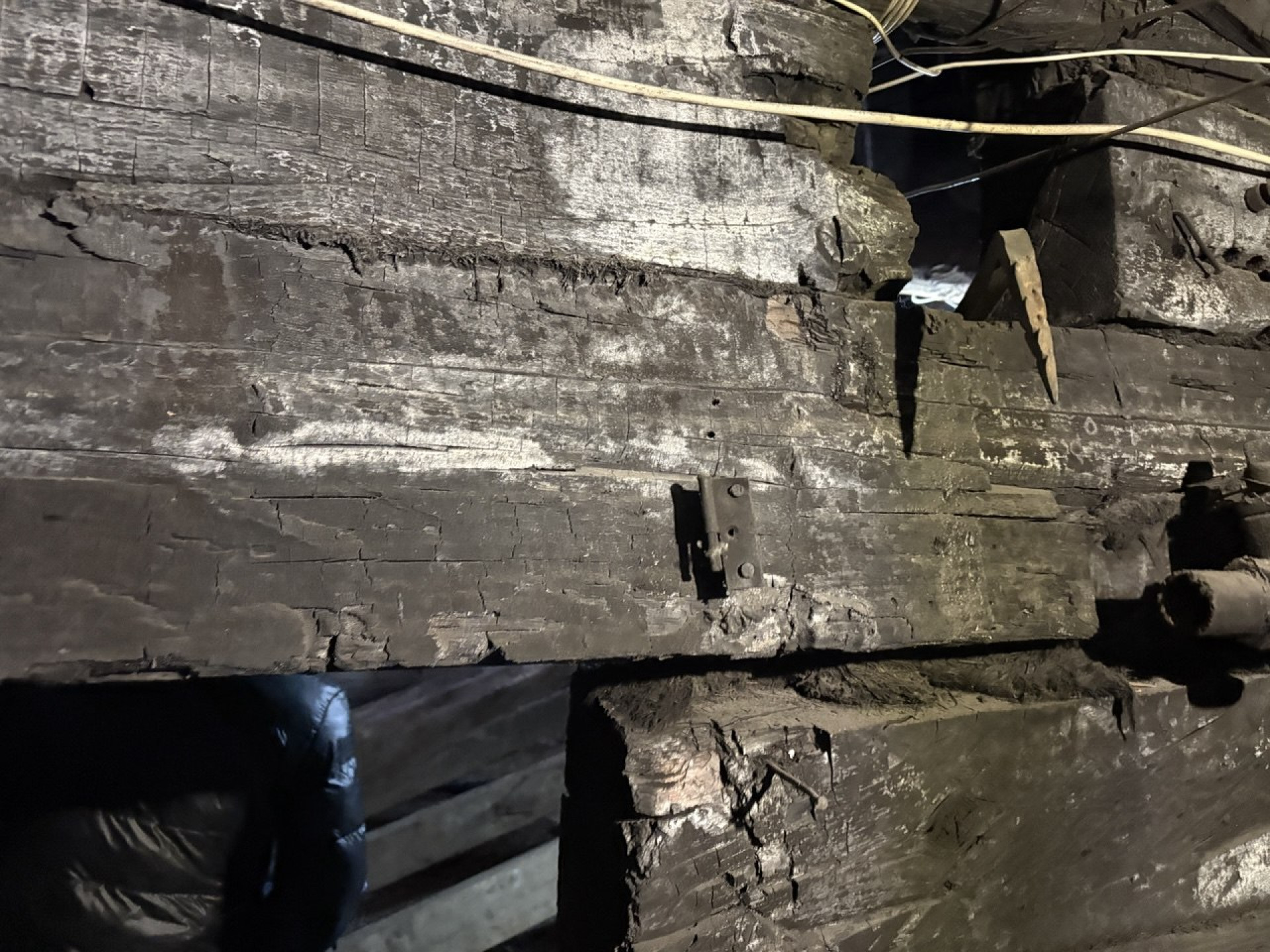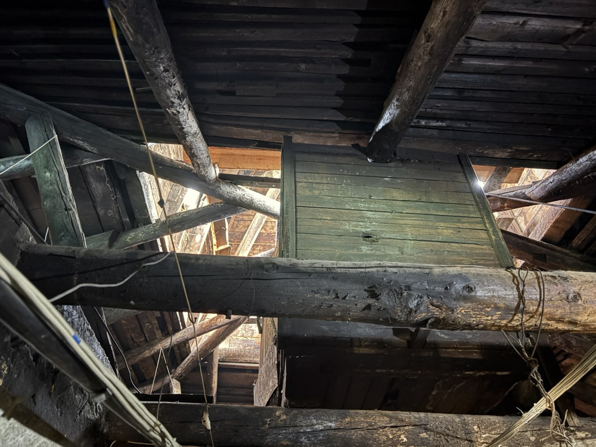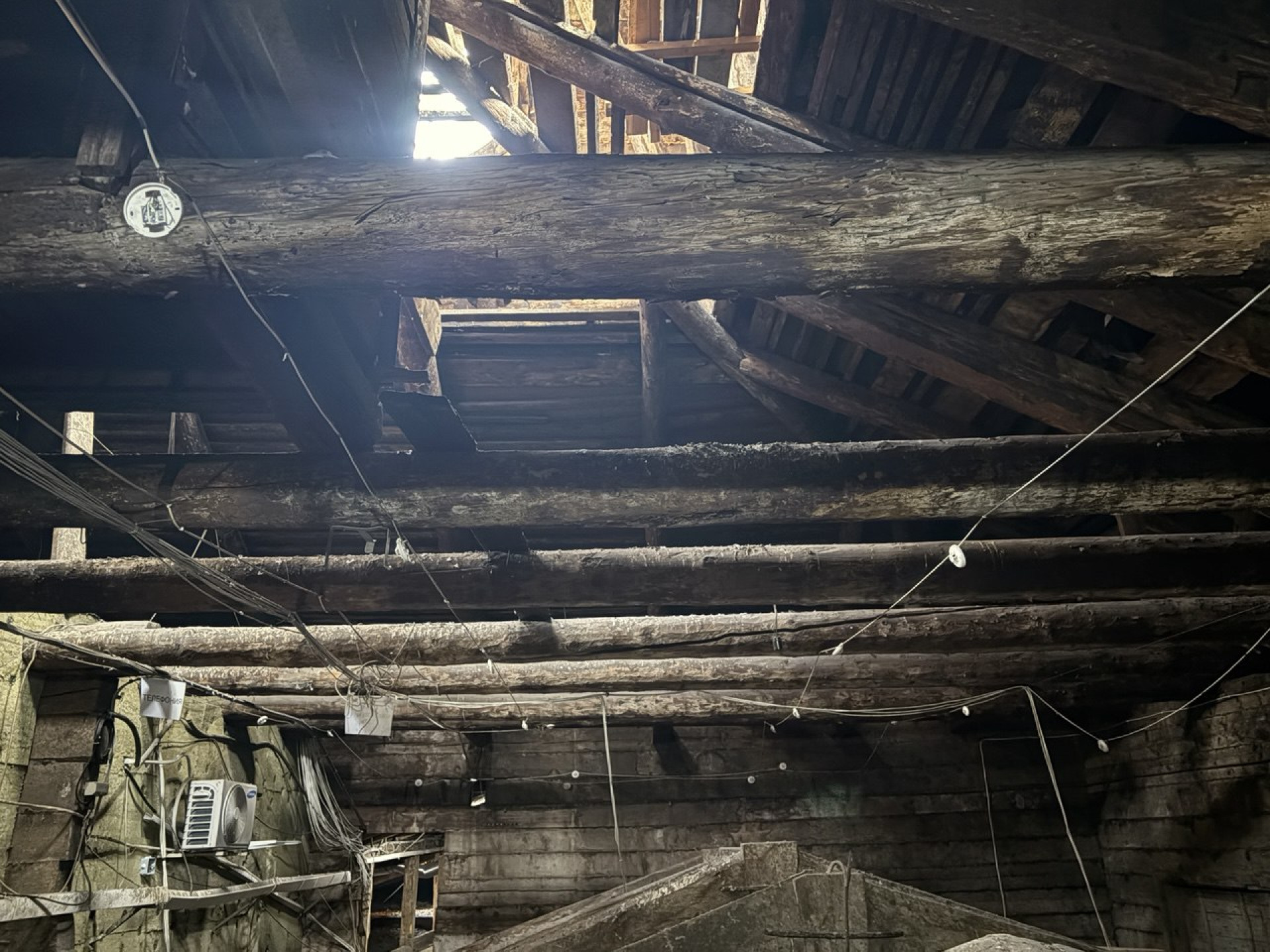 В ходе осмотра здания корреспондент отметил явный износ кровли: деревянные балки после прошлых пожаров выглядят обугленными, а при прикосновении дерево в некоторых частях рассыпается в руках.