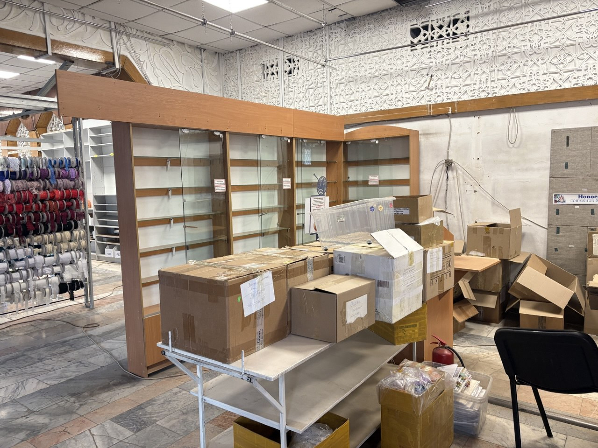 В декабре, когда корреспонденты приехали на объект, внутри продолжали освобождать пространство: торговые стеллажи уже убрали, а в одном стенде ещё оставались остатки товаров.