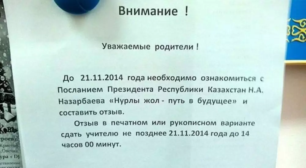 В официальном ответе Министерства образования и науки Казахстана пояснили, что организации образования могут осуществлять информационно-пропагандистскую работу по стратегическим направлениям государственной политики и по разъяснению Послания Главы государства на родительских собраниях, лекториях. Формы выбираются самостоятельно. Однако этого объявления в школах не размещали, утверждают в ведомстве.