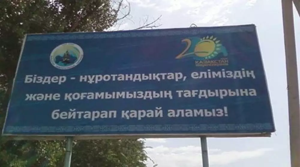 Билборд с резонансной надписью "Біздер - нұротандықтар, еліміздің және қоғамымыздың тағдырына бейтарап қарай аламыз!" ("Мы, нуротановцы, можем смотреть на судьбу народа и общества равнодушно"), мог оказаться подделкой с целью дискредитации. Об этом сообщили в партии "Нур Отан", отвечая на официальный запрос корреспондента Tengrinews.kz.