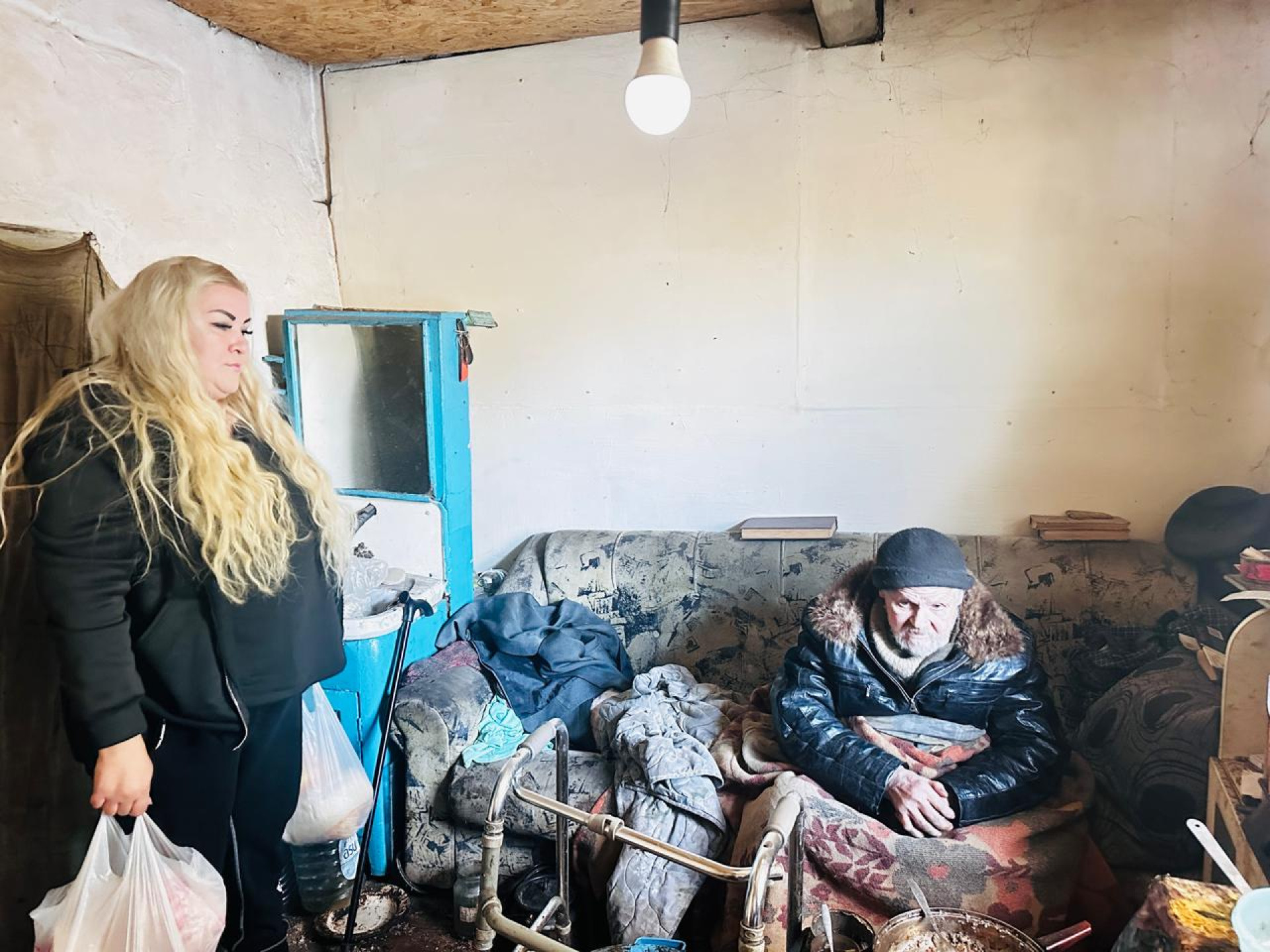 "Недавно навестили его и ужаснулись: он живет без еды, в холоде и полном одиночестве. Крыша в аварийном доме сильно просела, кажется, вот-вот рухнет. Воды в доме нет, печь топить нечем, есть нечего. Он сидел на диване, укутанный в тряпьё, руки ледяные. Замерзал и плакал. Рассказал, что последние дни почти не вставал - боялся упасть, от голода кружилась голова. Конечно, поняли, что зиму в таких условиях он не выживет", - говорит руководитель поискового отряда Екатерина Кудрявцева.