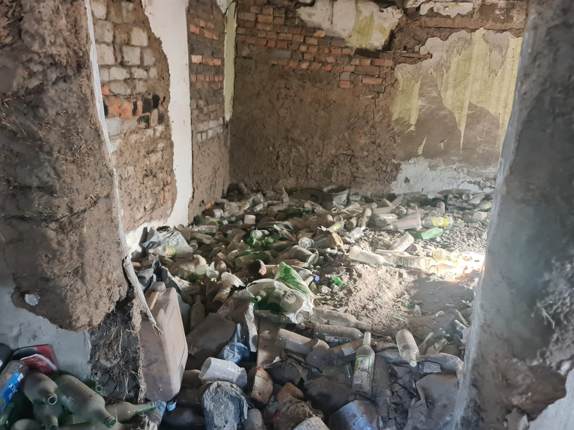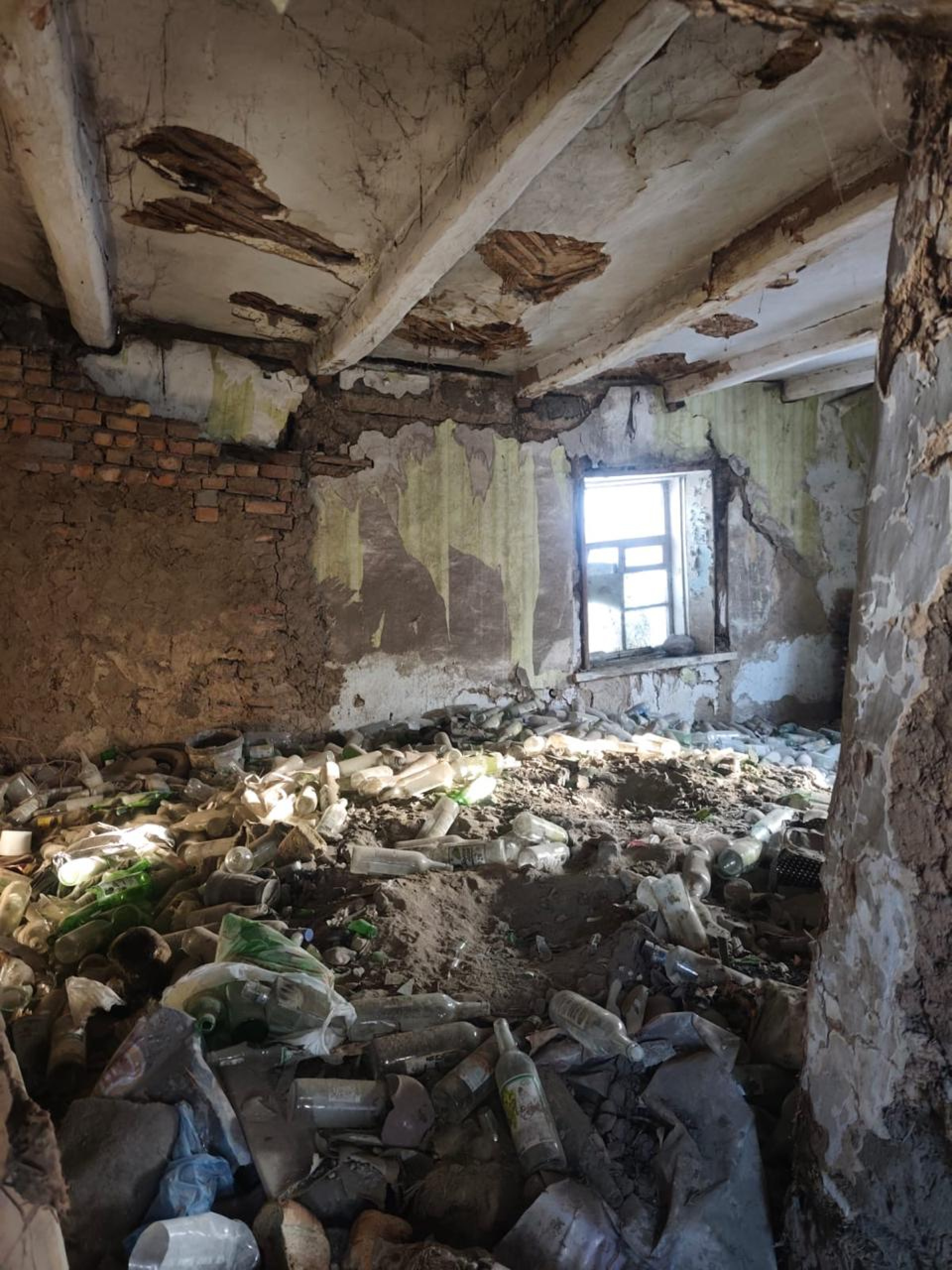 В одной из комнат - настоящая свалка из бутылок. По словам волонтеров, дядя Саша пытался использовать их для утепления: в полуразрушенном помещении с провисшим потолком часть стены он выложил именно из бутылок.