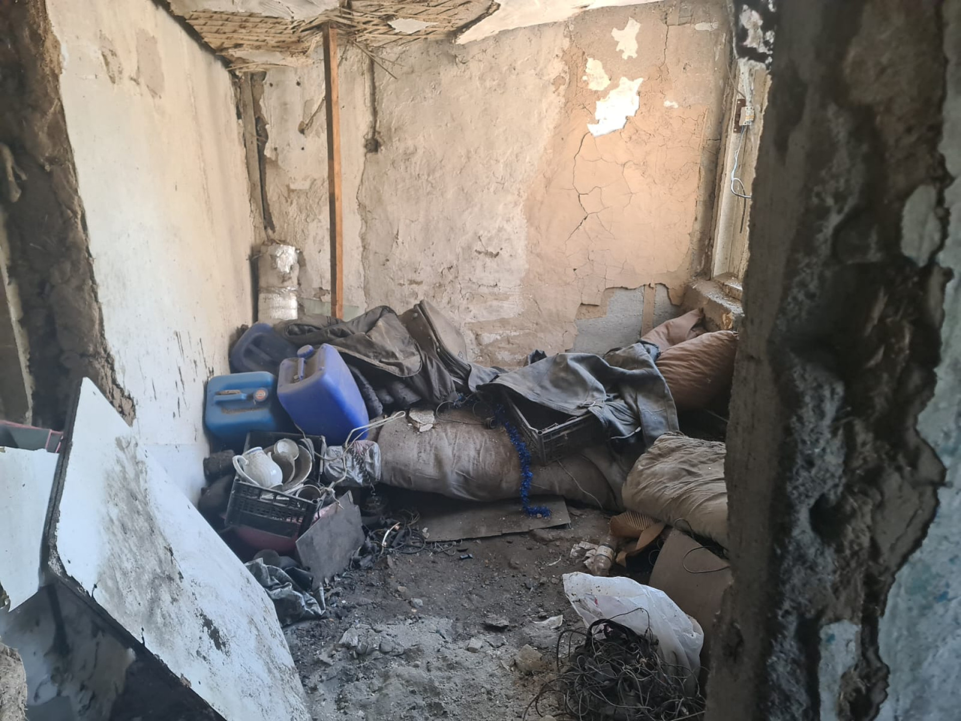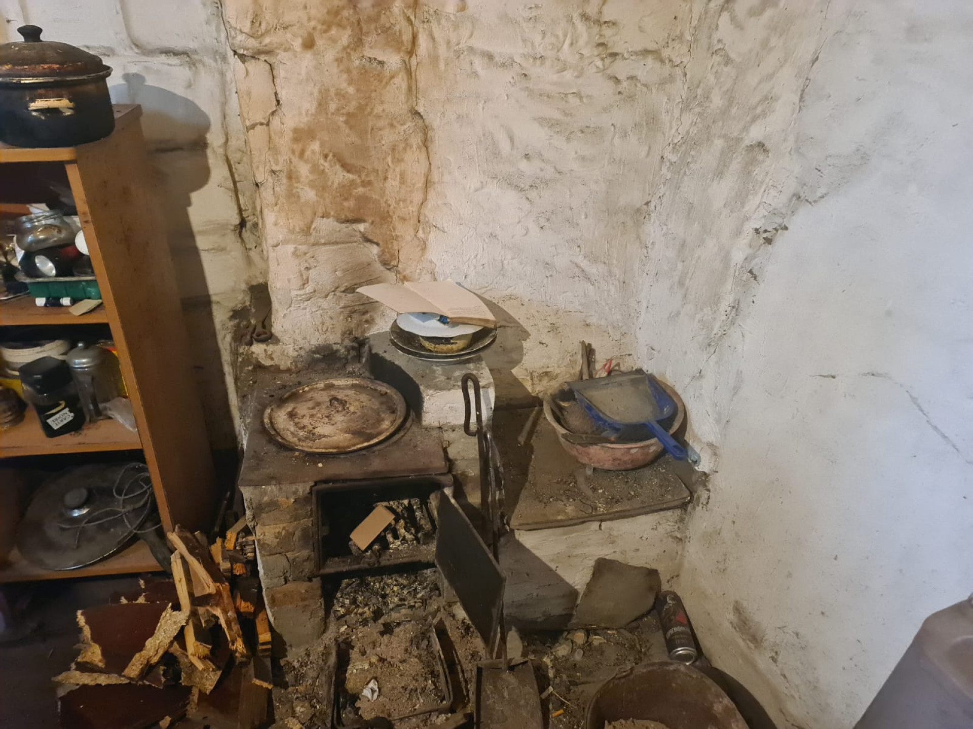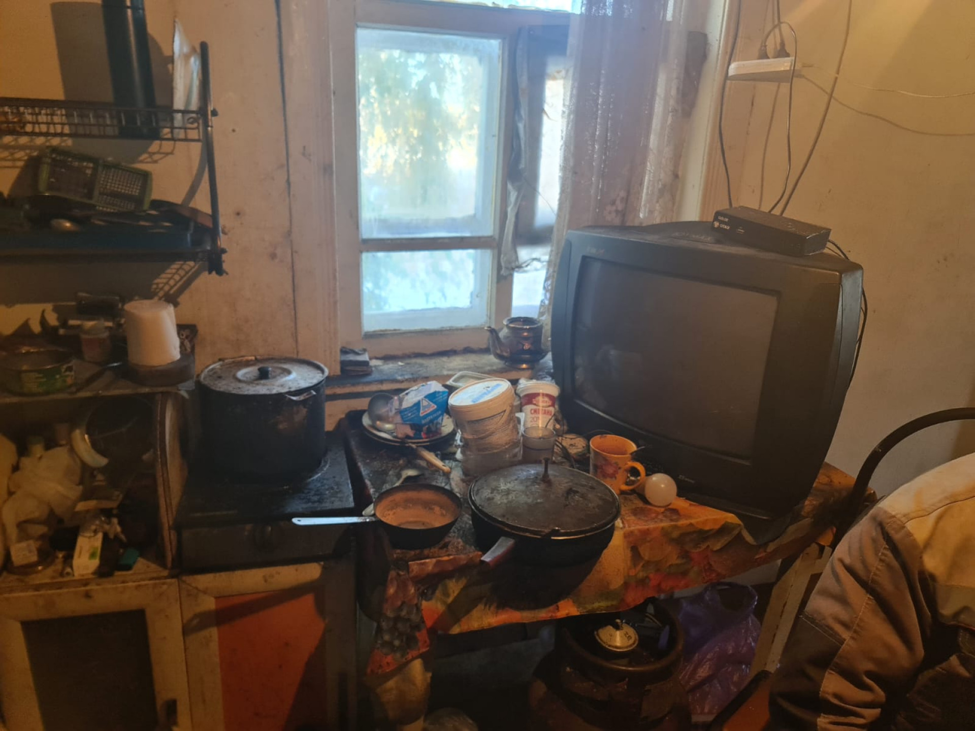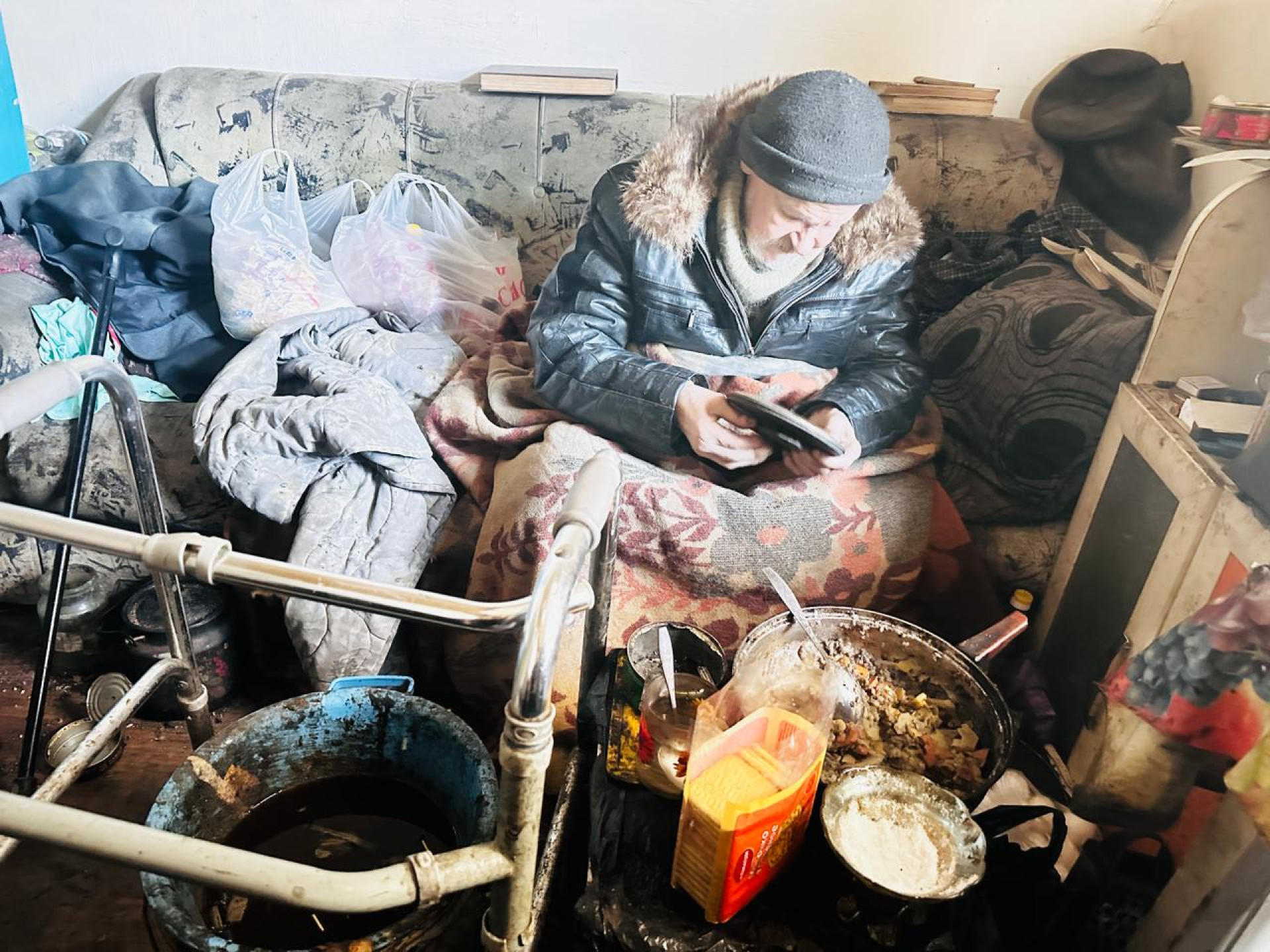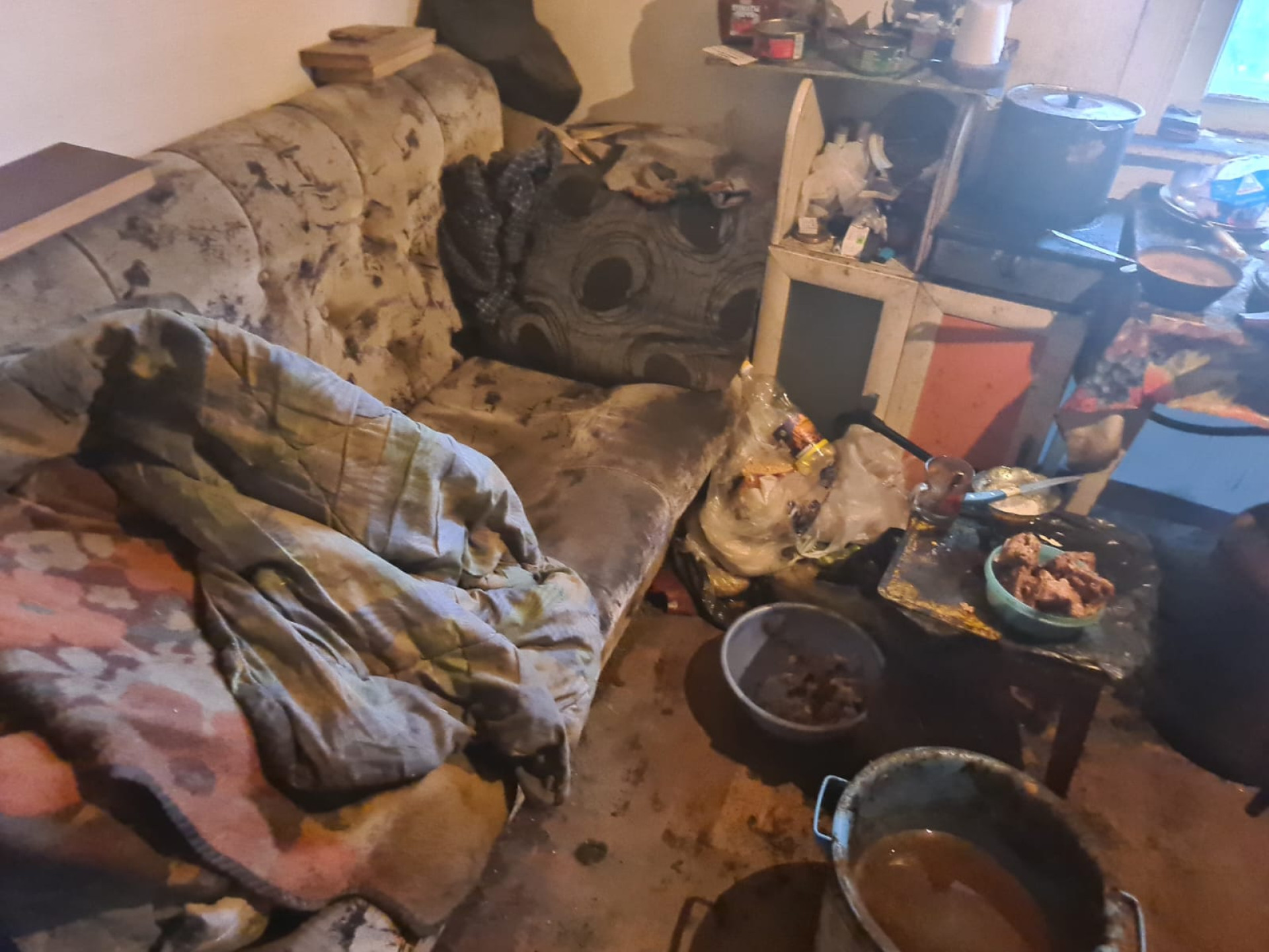 В жилых комнатах - нищета и полная антисанитария: закопченная, полуразвалившаяся печь, старый хлам, кровать и диван, стол, заваленный грязной посудой и объедками, повсюду тряпье и зловонное ведро, заменяющее туалет.