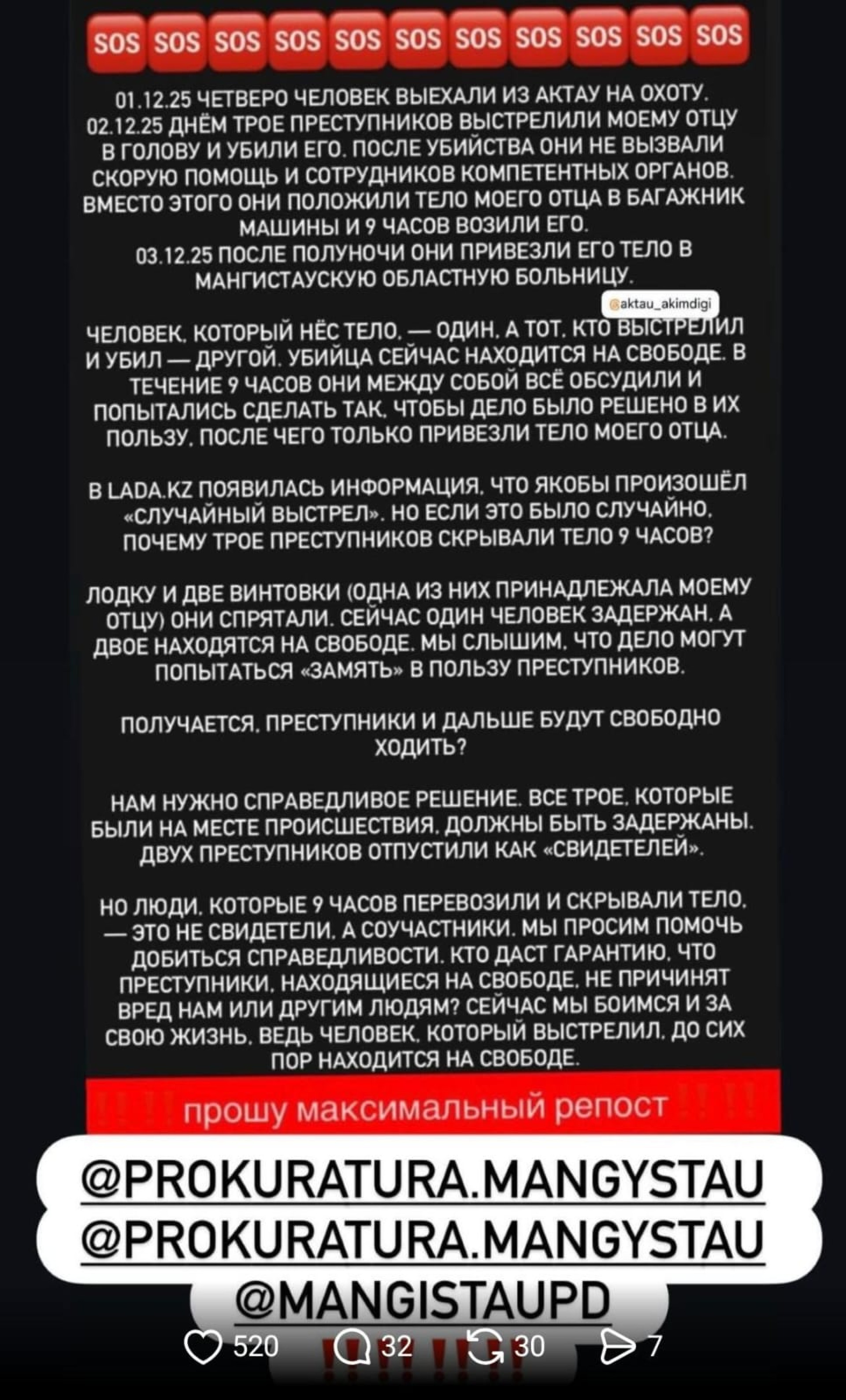 Следом говорится, что тело погибшего могли перевозить в багажнике автомобиля в течение девяти часов, а уже после полуночи, 3 декабря, доставили его в Мангистаускую областную многопрофильную больницу. Охотничьи же снаряжения, в том числе лодки и оружия, были спрятаны.