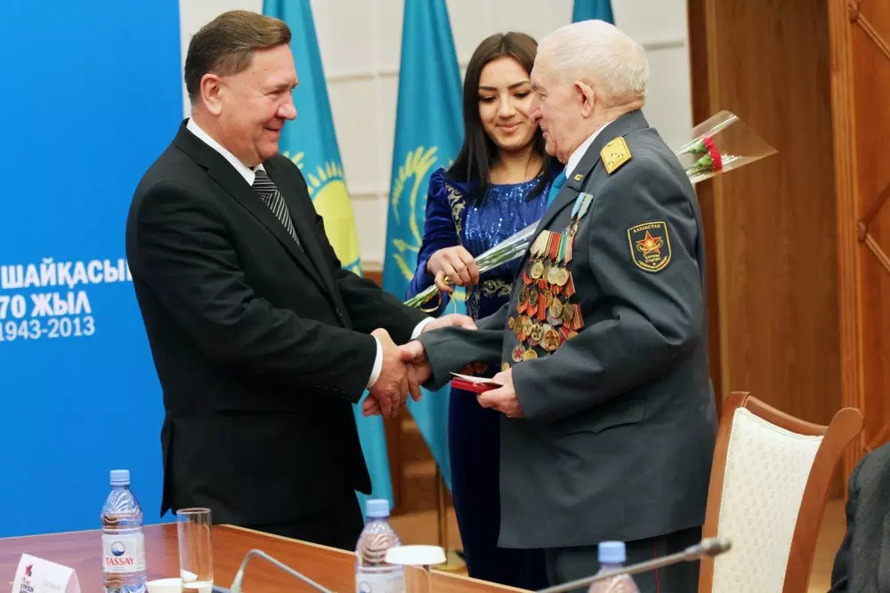 Российский губернатор Александр Михайлов встретился с казахстанскими ветеранами Курской битвы и вручил им памятные нагрудные знаки, передает корреспондент Tengrinews.kz.