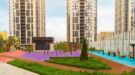 Внутридворовая территория площадью 3,5 гектара вмещает в себя все, делая "Комфорт сити" не просто жилым комплексом, а целым самодостаточным кварталом: беговые дорожки, батуты, детские игровые комплексы, качели, футбольные и баскетбольные площадки, корт для большого тенниса.