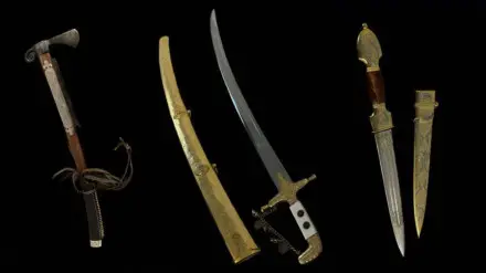 Среди них – коллекционные ручки, монеты, сабли, кинжалы, топоры и даже ремень с национальным орнаментом.