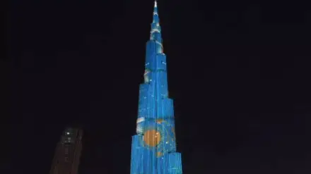 Как отмечает телеканал, иллюминация в виде небесно-голубого казахстанского флага демонстрировалась на самом высоком здании в мире около одной минуты.