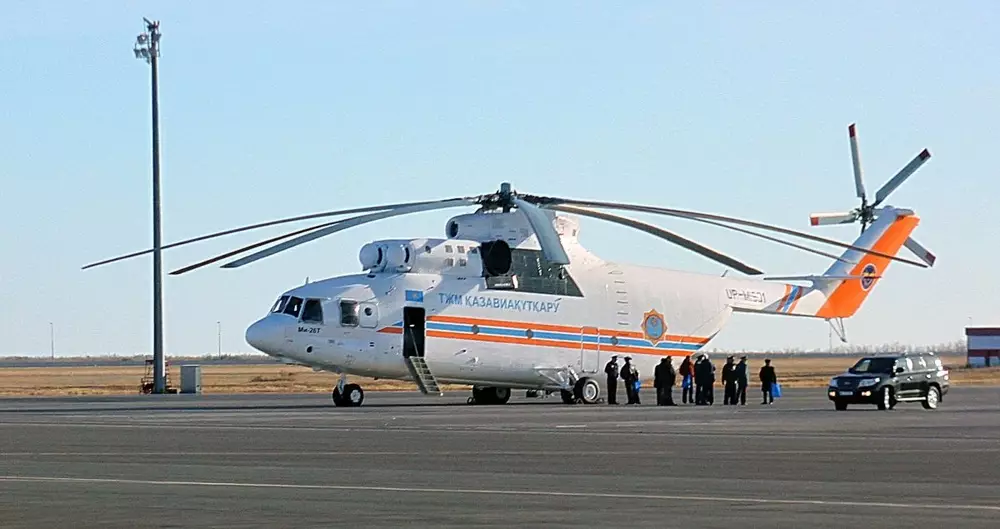 Самый большой в мире вертолет Ми-26Т приняло в эксплуатацию Министерство по чрезвычайным ситуациям Казахстана, передает Tengrinews.kz. 12 октября 2013 года самый большой в мире вертолет совершил беспосадочный перелет из Новосибирска в Астану. Второй Ми-26Т прибудет в Казахстан в середине ноября. Два транспортных вертолета Ми-26 были восстановлены и модернизированы по заказу МЧС РК в Новосибирске. По информации министерства, вертолеты были оснащены современным пилотажно-навигационным комплексом и оборудованием специального назначения, позволяющим проводить масштабные спасательные операции. "Один борт у нас будет стоять в Алматы, потому что там у нас много пожароопасных участков. Помните, пожар на Медео? Если бы у нас такой вертолет был, а он имеет подвесное устройство для тушения пожаров, нам было бы легче. Второй вертолет мы планируем поставить в Атырау, поскольку началась разработка на Кашагане, идут очень серьезные работы, связанные с освоением шельфа, и иметь такую спасательную транспортную технику как этот вертолет, будет очень правильно", - сказал министр по чрезвычайным ситуациям РК Владимир Божко в ходе презентации воздушного судна в Астане. По его словам, на модернизацию каждого вертолета затрачено 2 миллиарда тенге. "Вертолет такой в мире редко где есть, и в Казахстане появился второй. Первый в министерстве обороны, у нас (МЧС -Прим. автора)- второй. Хочу сказать, что у министерства появились уникальные транспортные возможности. Это вертолет, который может взять на борт 100 человек одномоментно с полным вооружением, Этот вертолет может поднять такое количество воды, что я даже уже предупредил, чтоб на неустойчивые здания не сваливали. И, в-третьих, это хороший транспорт, который берет большую нагрузку и на длительное расстояние - около 2 тысяч километров", - сказал Божко. По данным МЧС, с помощью вертолета можно проводить экстренную эвакуацию пострадавших с места аварий и катастроф с возможностью взлета/посадки в условиях малых площадок, доставку автотранспорта, спецтехники, медбригад, доставку 14 тонн топлива, проводить пожаротушение, в том числе труднодоступных источников возгорания с применением штатной подвесной емкости объемом 15 кубических метров. Ми-26 - самый большой в мире серийный транспортный вертолет, на счету которого не один десяток мировых рекордов и выполненных нестандартных заданий. Вертолет предназначен для перевозки крупногабаритных грузов и техники весом до 20 тонн. Центральная часть фюзеляжа включает в себя грузовую кабину размером 12,00 × 3,25 × (2,95-3,57) метров и задний отсек, переходящий в концевую балку. В транспортно-десантном варианте вертолёта могут разместиться 82 человека с полным снаряжением. В санитарном варианте вертолёта возможно разместить до 60 носилок с ранеными. Для погрузки крупногабаритных грузов в грузовой кабине расположена электролебёдка с тяговым усилием до 500 килограмм. Также вертолёт способен перевозить грузы на внешней подвеске. Самый большой в мире вертолёт может быть также использован при расчистке завалов, перевозках и монтаже тяжелого оборудования, при сооружении дамб и восстановлении линий электропередач. Сочетание большой грузоподъемности и высокой крейсерской скорости делает применение вертолета экономически выгодным.