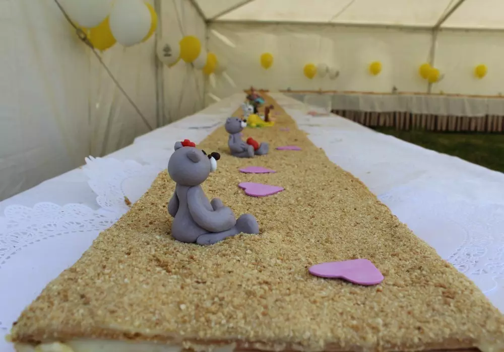 Для того, чтобы угостить всех детей тортом, организаторы праздника установили большой шатер. 30-метровый медовик весом в 225 килограммов готовили всего два кулинара столичного кондитерского цеха. Всю минувшую ночь мастера выпекали коржи: ушло 40 килограммов муки, более 500 яиц, 25 килограммов сахара и пять килограммов меда. Для оформления торта было сделано 60 фигурок сказочных персонажей из цветного сахара.