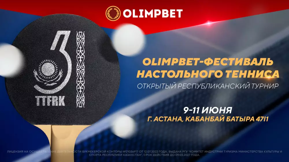 9 июня в Астане стартует Открытый республиканский турнир "OLIMPBET - Фестиваль настольного тенниса". Его участники выступят в категориях: "Профессионалы", "Любители", "Ветераны", "Кадеты".