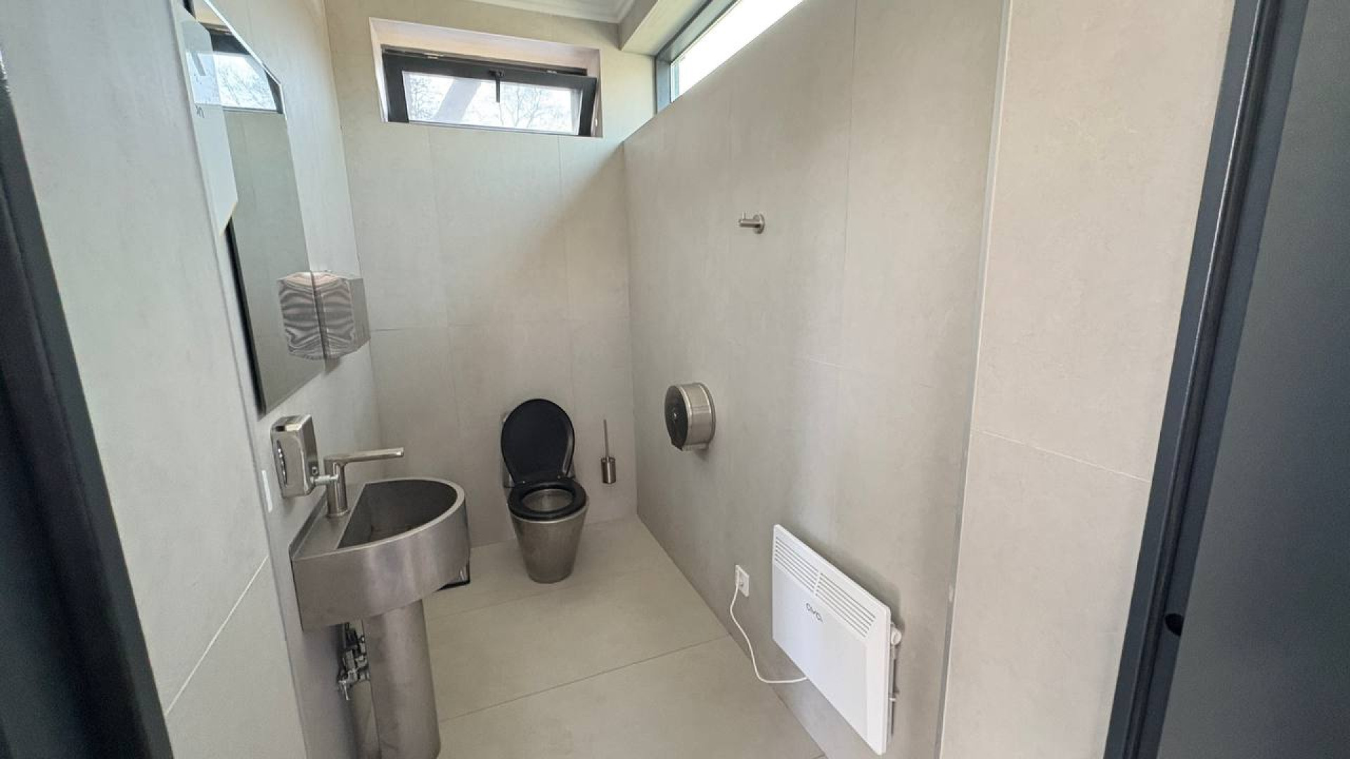 Внутри мы увидели стандартный набор: унитазы, раковины, зеркала и обогреватели. Тем не менее без недочётов не обошлось: во время проверки ни в одной из кабин не было ни мыла, ни салфеток.