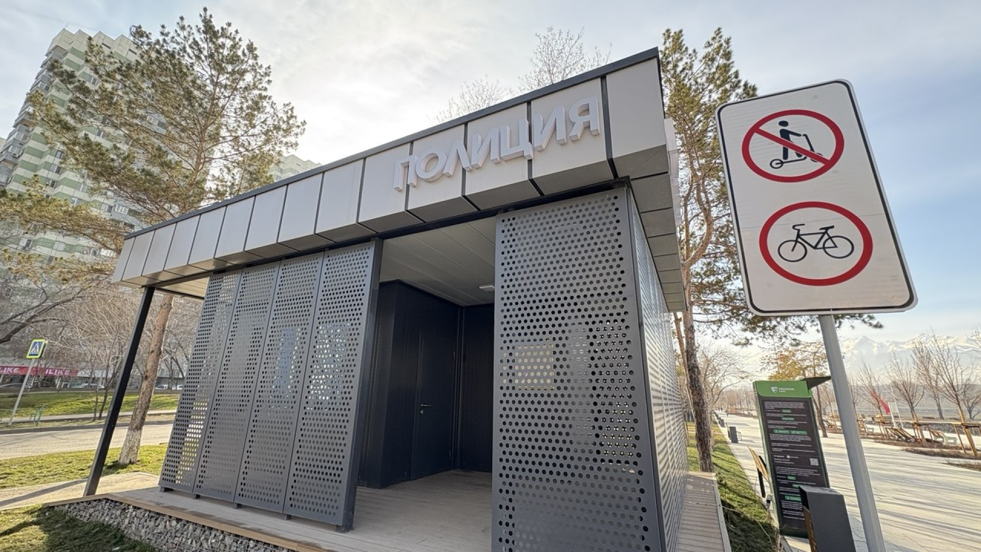 Первое, что бросается в глаза при входе на Сайран с восточной стороны, — модульный полицейский пункт. По генплану таких объектов должно быть два, и оба действительно установлены.