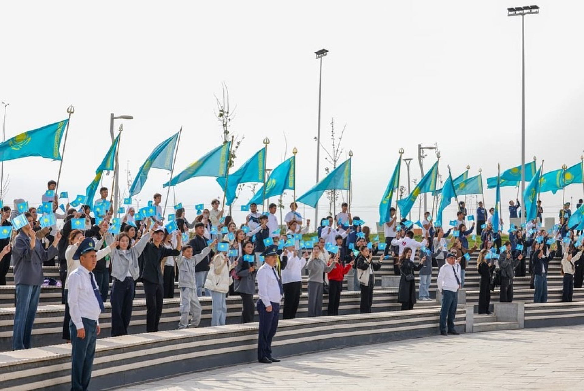 Церемония началась с исполнения государственного гимна Республики Казахстан. В этот момент голубое знамя — символ свободы и мира — величественно взмыло над площадью, олицетворяя силу и сплочённость казахстанского народа.