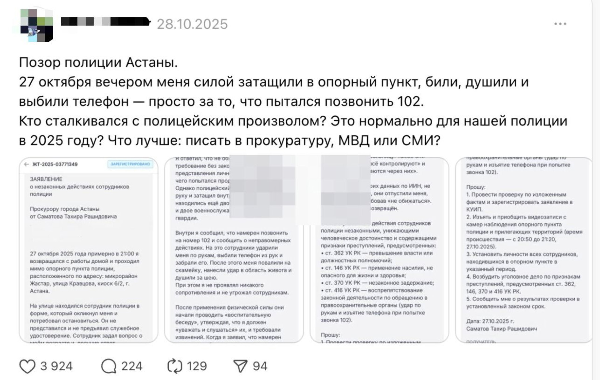 В конце октября в соцсети Threads появилось обращение жителя Астаны, который заявил, что полицейские якобы задержали его, применив силу, доставили в опорный пункт и избили. На жалобу астанчанина ответили в департаменте полиции Астаны, передаёт корреспондент Tengrinews.kz.