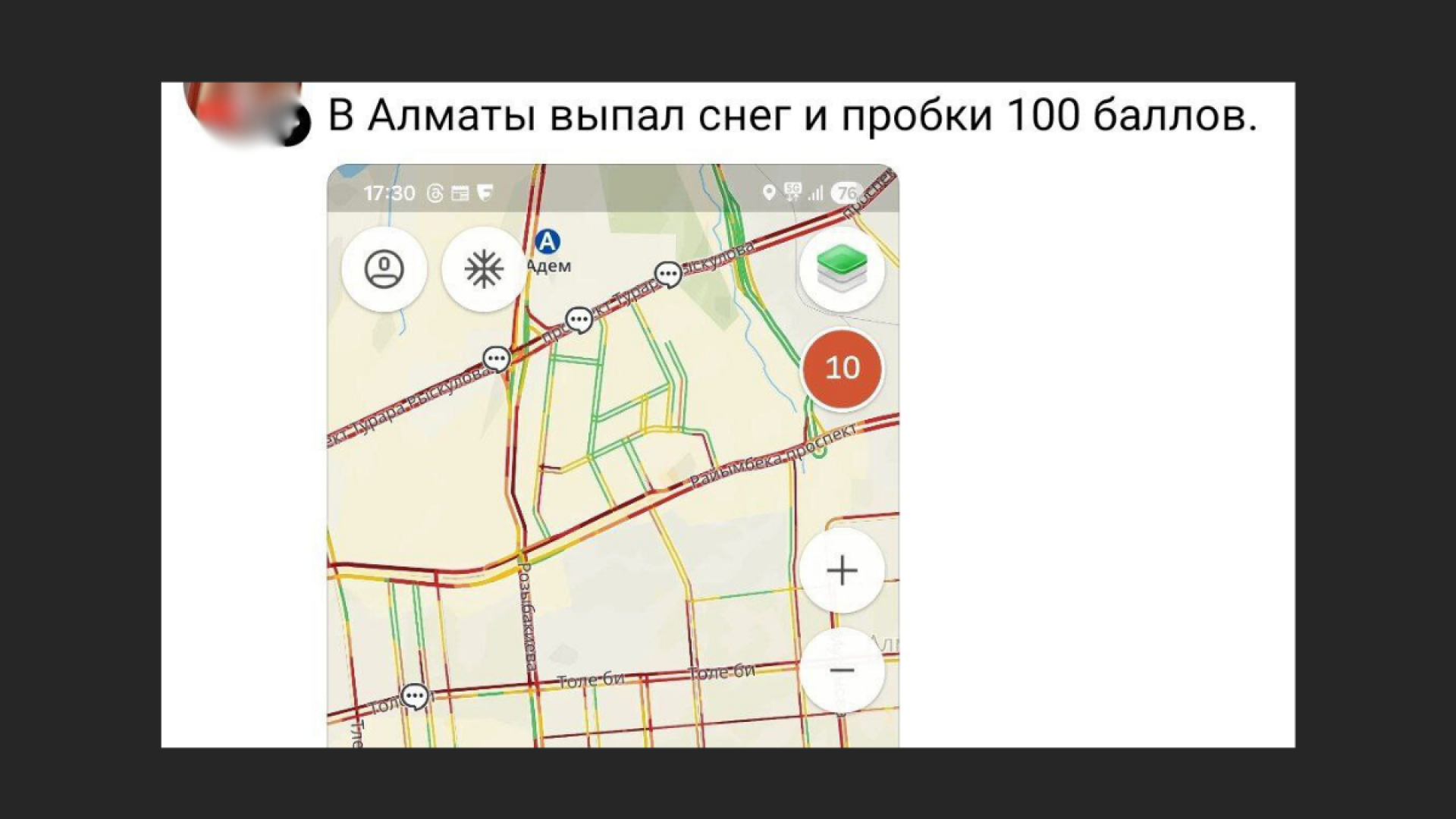 Некоторые алматинцы с юмором отмечают, что дорожная ситуация сегодня далека от обычных 10 баллов - по ощущениям пробки тянут сразу "на все 17" или даже "на все 100".
