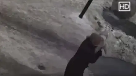 На видео запечатлен момент, когда женщина с грудным ребенком на руках идет через двор и внезапно с крыши падает глыба льда. Женщина падает без сознания, а ребенок оказывается на земле.
