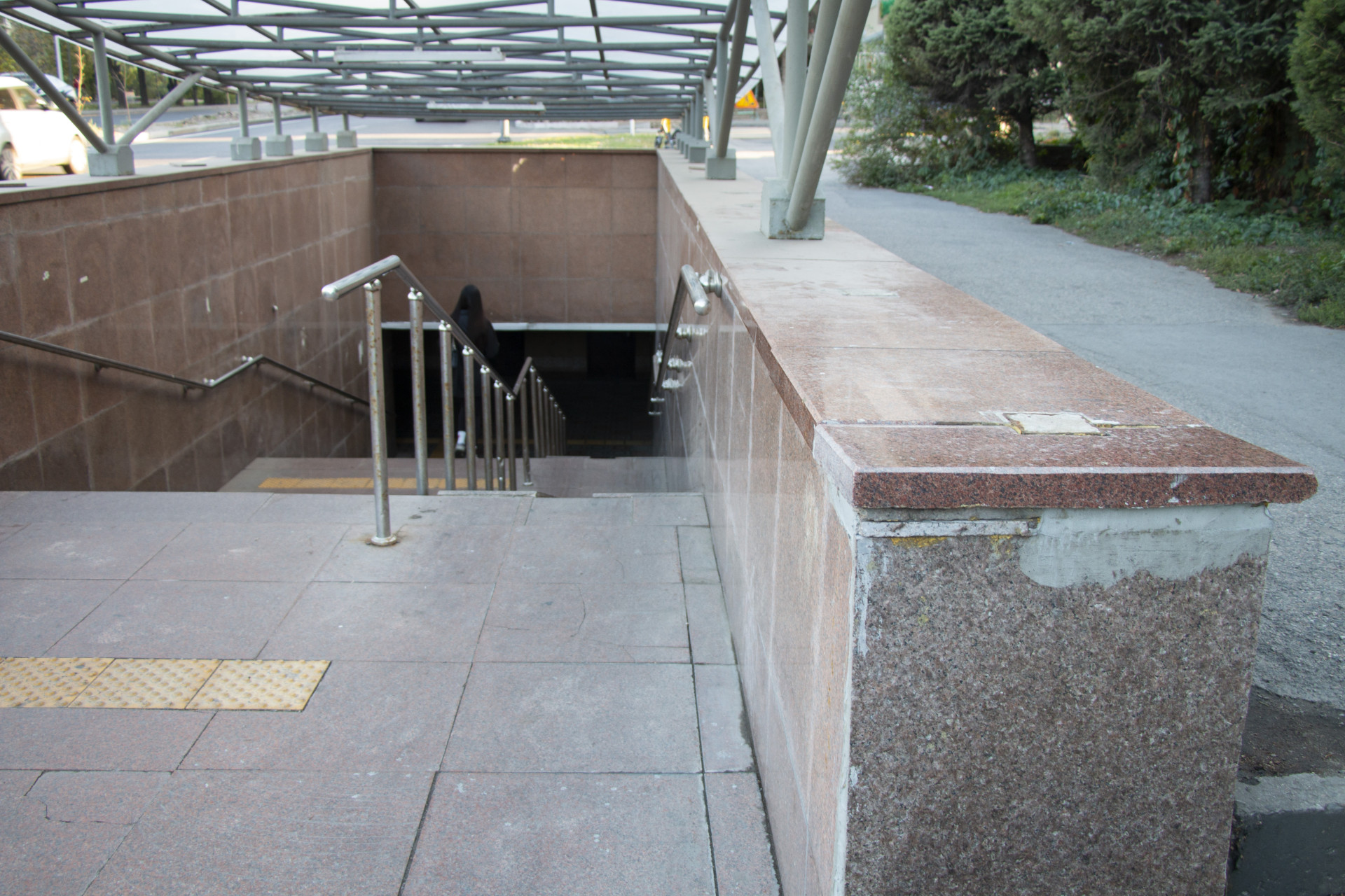 Освещение в самом пешеходном переходе есть, но тусклое. Местами из-за сырости со стен отвалилась штукатурка. При этом пол и потолок не утратили свой изначальный вид.