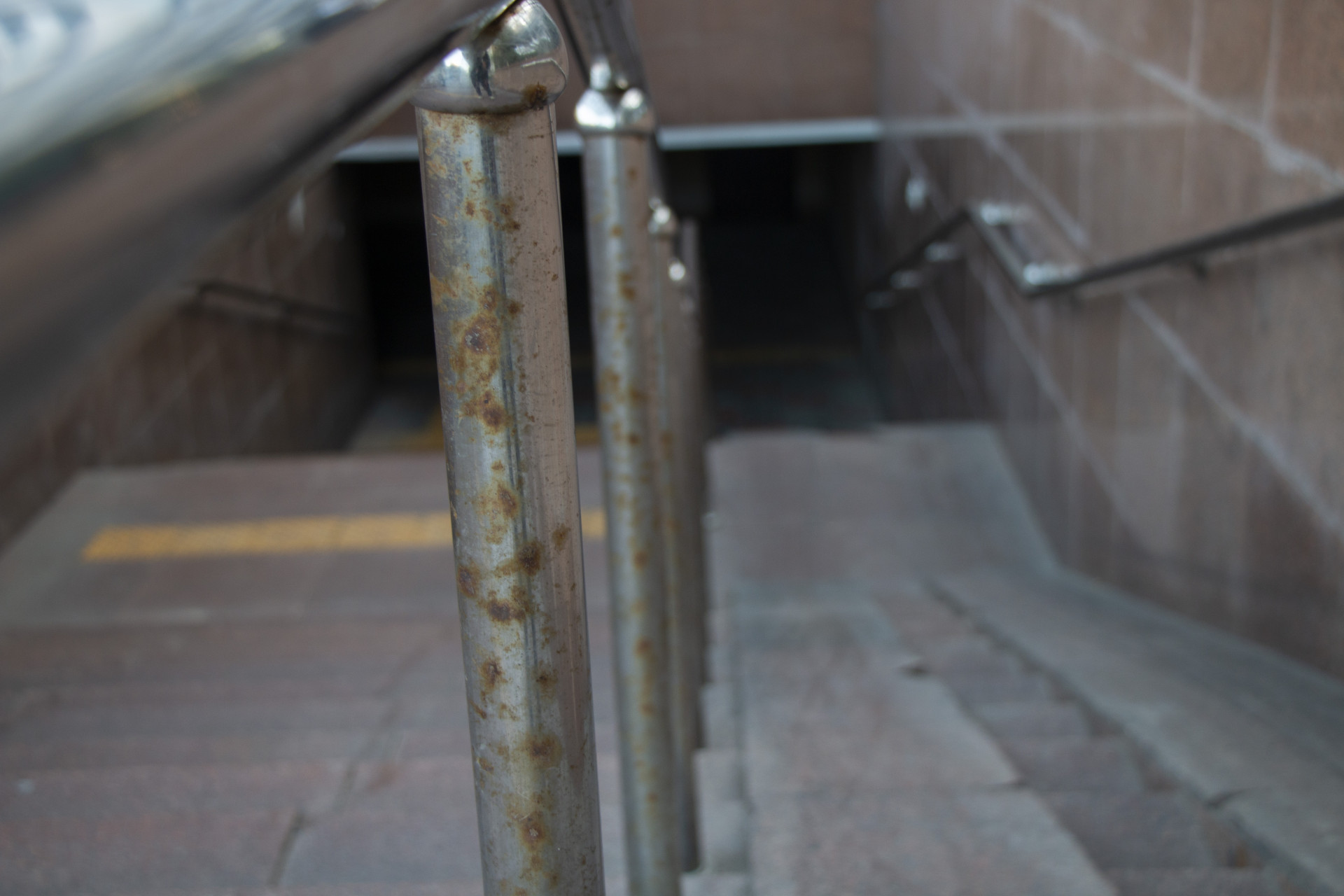 Сам переход не производит впечатления непригодного к использованию. Хоть и видно, что местами он уже подвергался ремонту. А поручни покрылись коррозией.